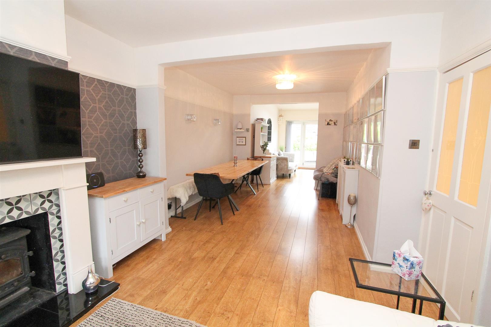 Wood flooring, covered radiator, picture rail, wall lights, wall mounted “hive” heating control, archway to..