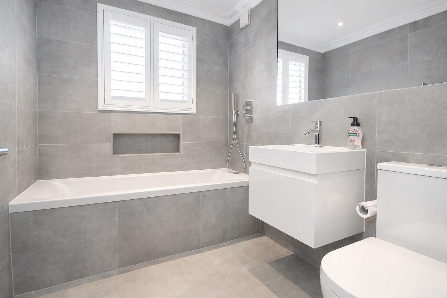 Comprising panel enclosed bath with chrome mixer tap and hand attachment, floating wash hand basin with chrome mixer tap, low-level push button flush WC, heated chrome towel rail, tiled flooring, tiled walls, extractor fan, coved ceiling, obscure UPVC double glazed window to rear aspect, fitted plantation shutters.