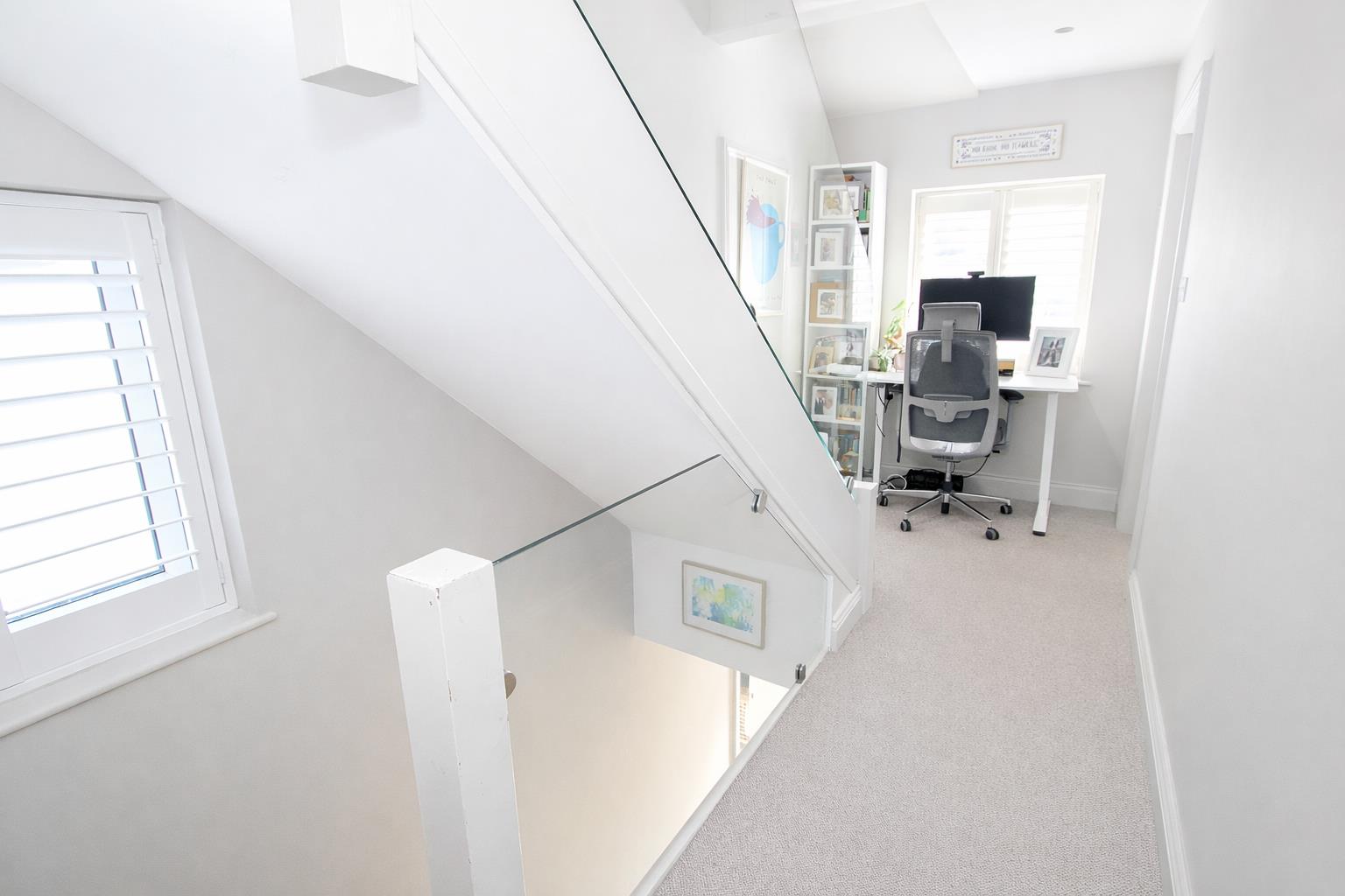 Feature glass balustrade, obscure UPVC double glazed window to side aspect and window at front, fitted plantation shutters, double panel radiator.