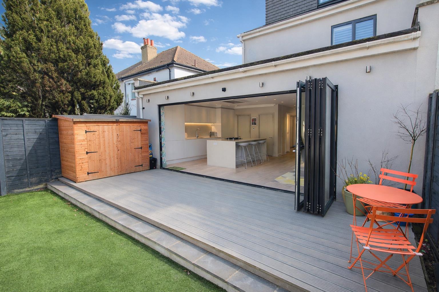 Decking area leading to artificial lawn section and raised flowerbeds at rear, fence enclosed, outside lighting and power supply, outside tap.