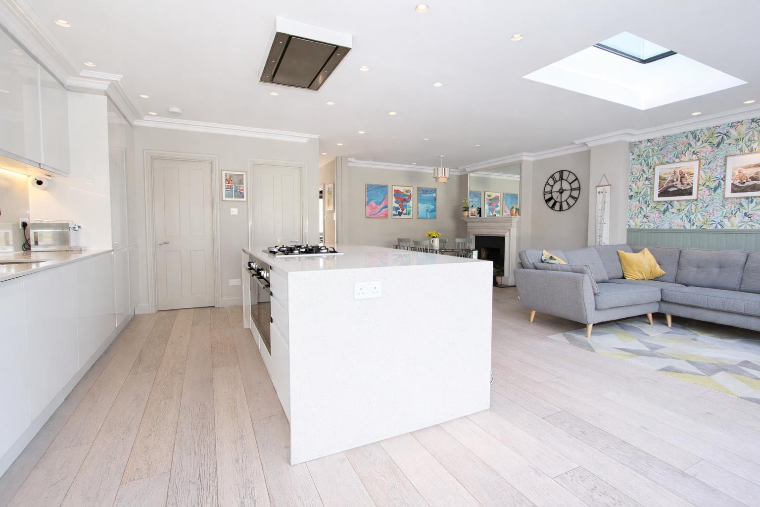 Range of fitted gloss wall units with matching cupboards and drawers below, marble effect worktops with inlaid stainless steel sink and brushed chrome mixer tap, island with breakfast bar, inlaid gas hob with double oven/grill below, integrated fridge/freezer, integrated dishwasher and washing machine, oak flooring with underfloor heating, feature skylight, coved ceiling, fireplace with stone surround, double glazed bifold doors to rear aspect.