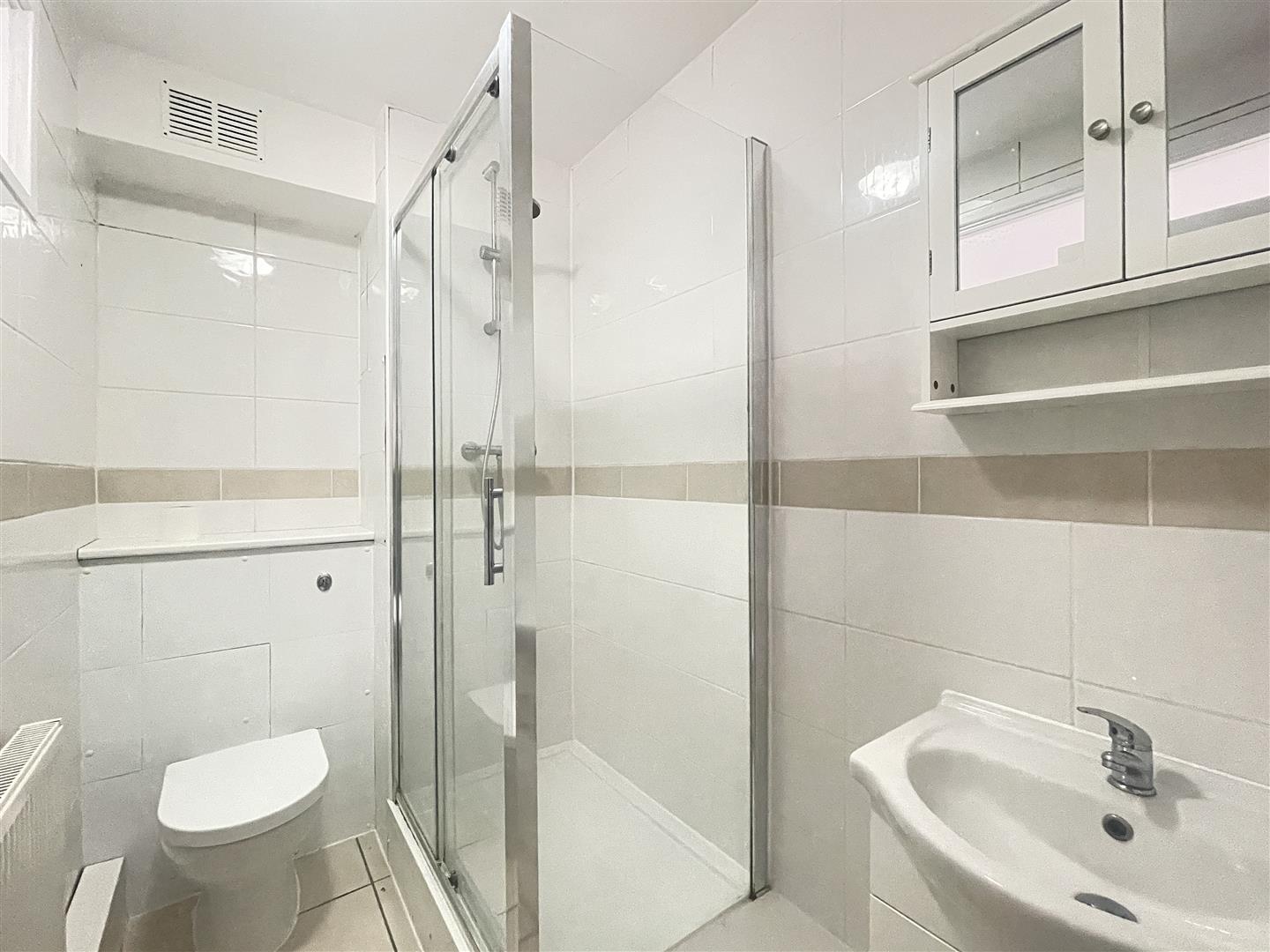 A modern three piece bathroom suite, fully tiled, comprising of WC, enclosed shower cubicle and vanity unit