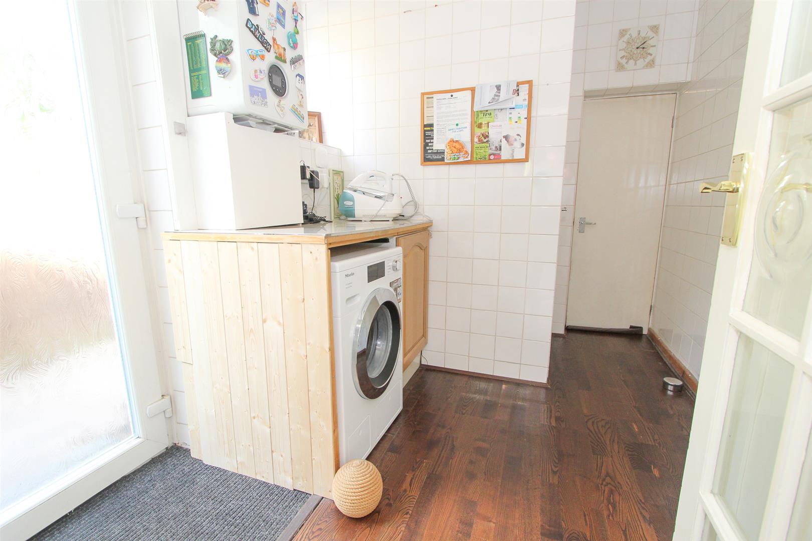 UPVC double glazed dual action windows to rear and side aspects and door leading to garden, wood laminate flooring, space and plumbing for tumble dryer.
