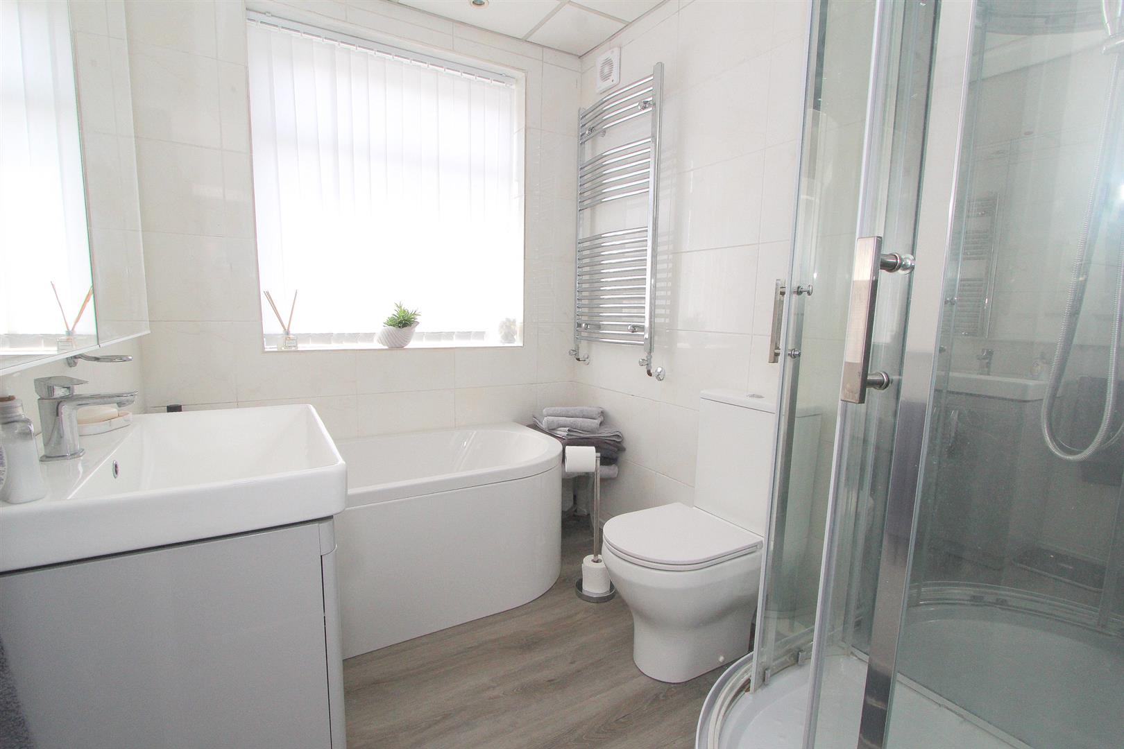 Modern four piece suite comprising panel enclosed bath with chrome mixer tap, shower cubicle with jets, hand attachment, fitted seat and integrated speaker system, wash handbasin with chrome mixer tap storage cupboard below, low-level push button flush WC, heated chrome towel rail, tiled walls, extractor fan, obscure UPVC double glazed window to front aspect.