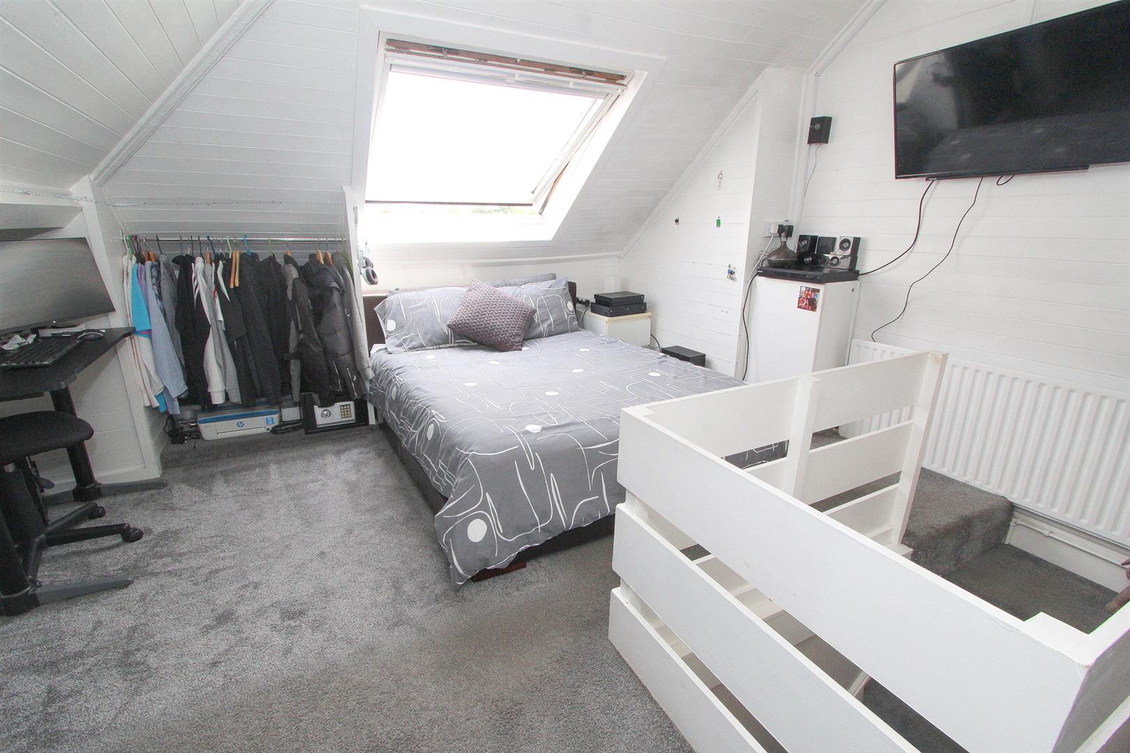 Velux window to rear aspect, fitted storage cupboards and hanging rail, single panel radiator.
