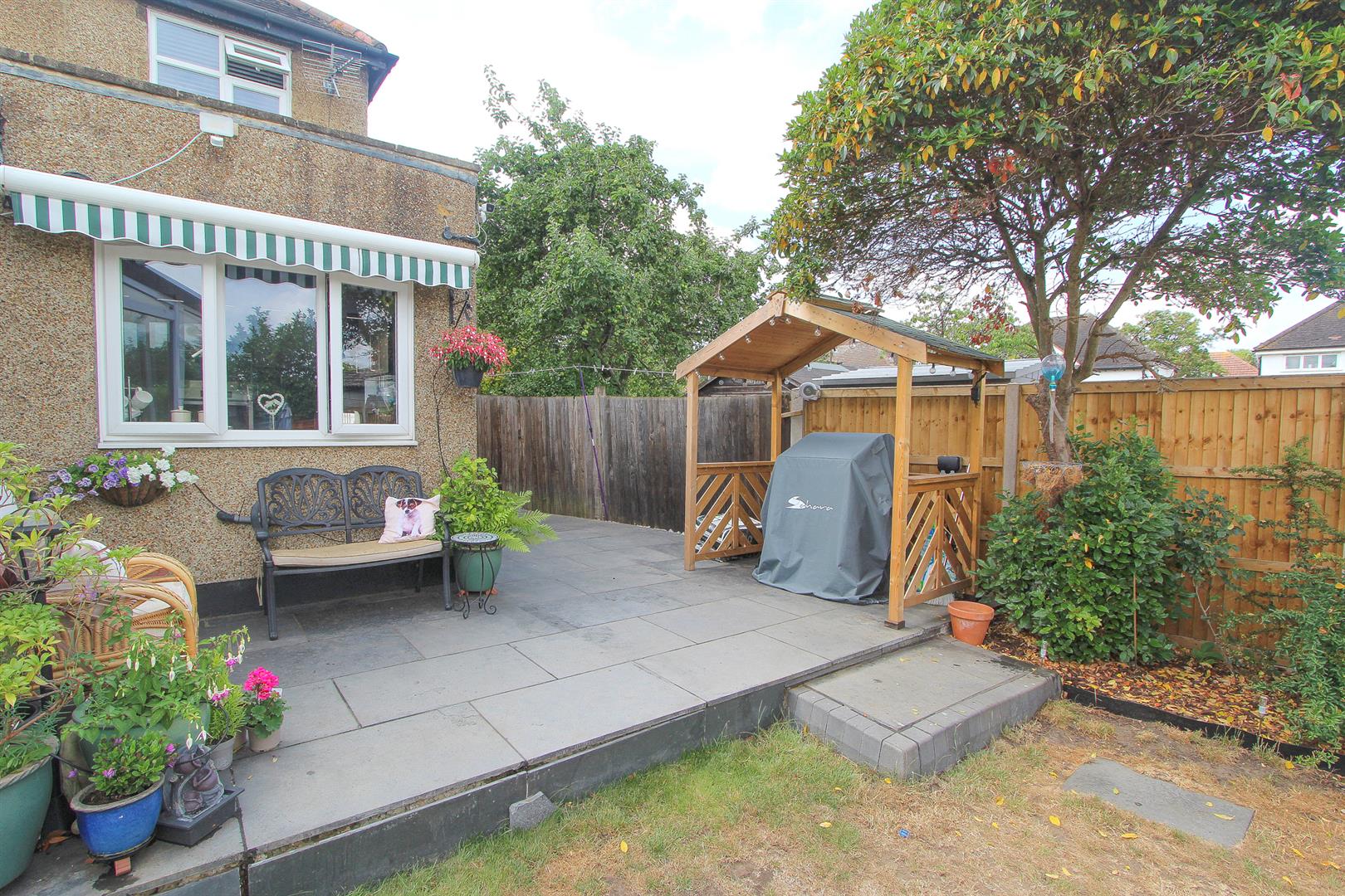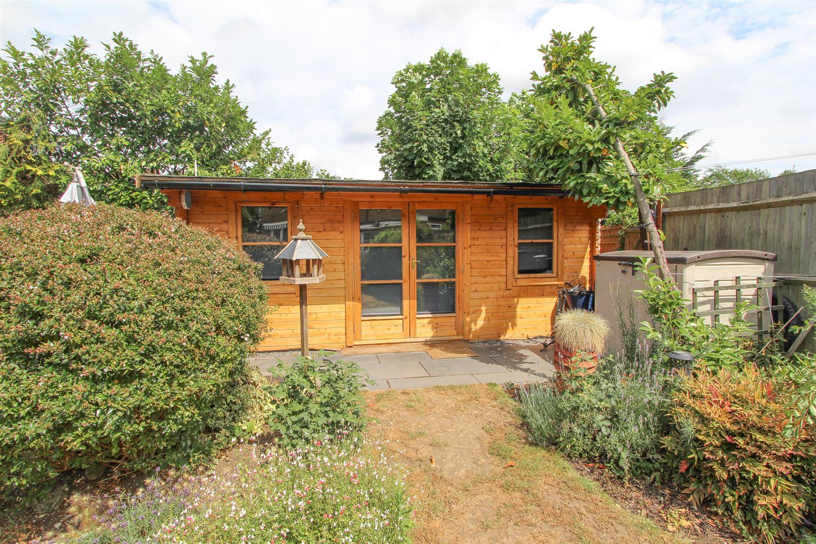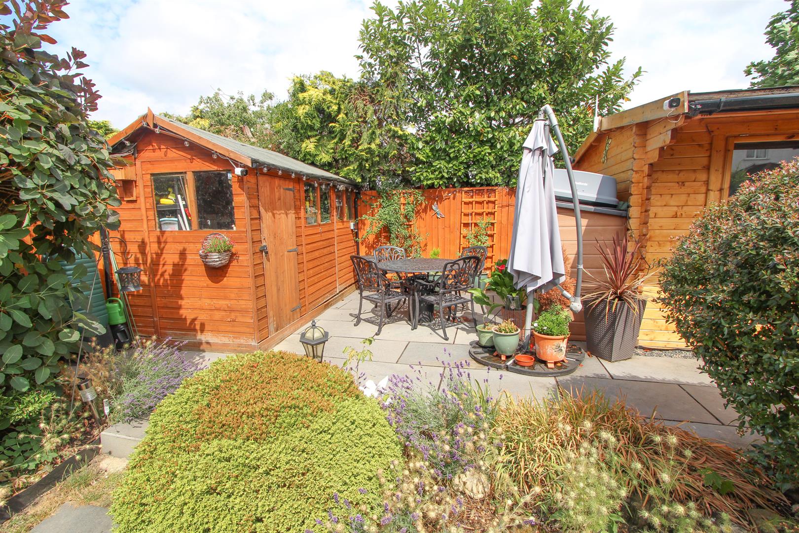 Rear garden – approximately 90ft (Easterly aspect) Large paved patio area with gated side access and footpath leading to rear, further patio area, mainly laid to lawn with mature shrubs and plants bordering, garden shed with power supply, detached log cabin with power and light, outside tap, fence enclosed.