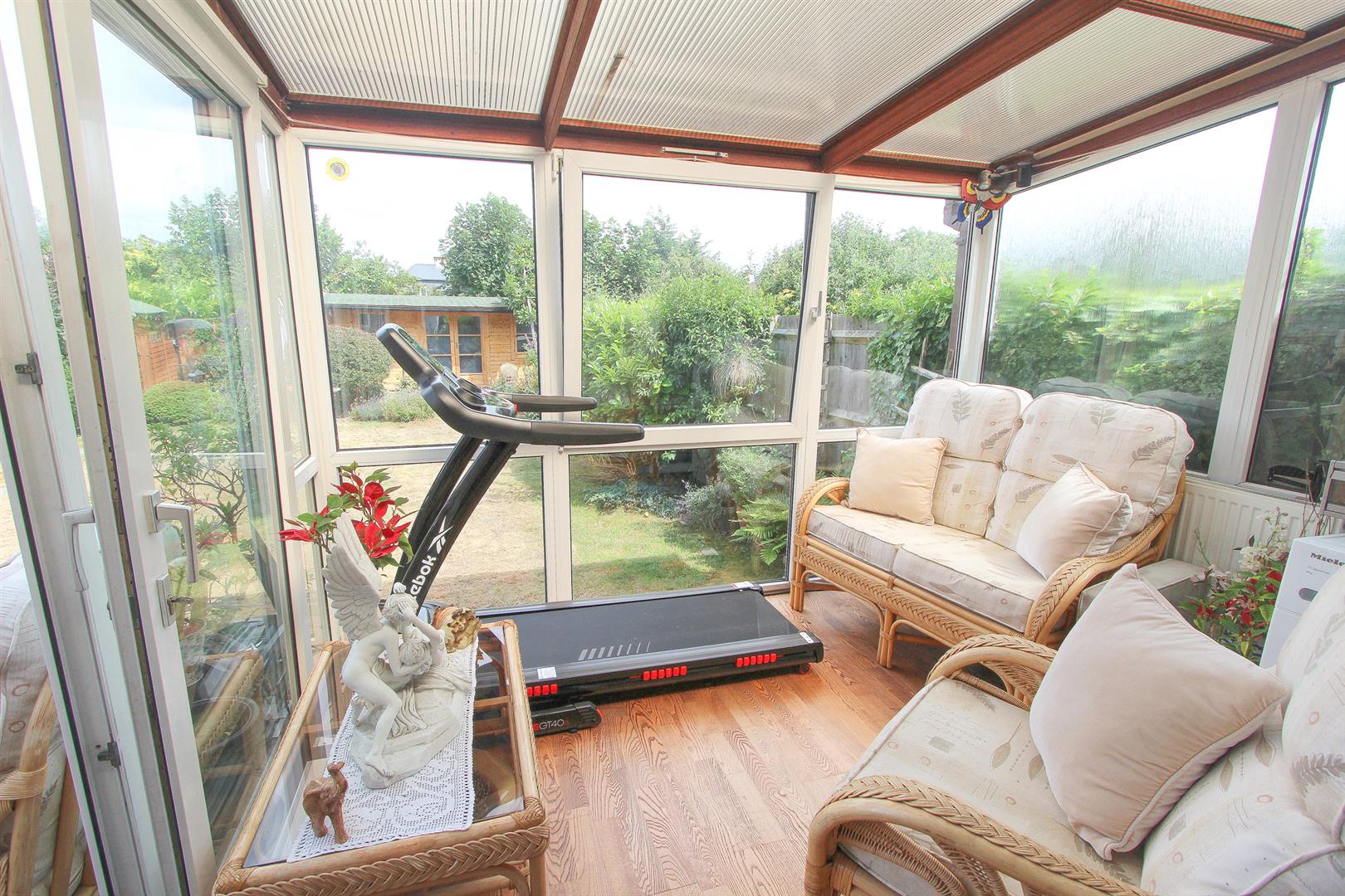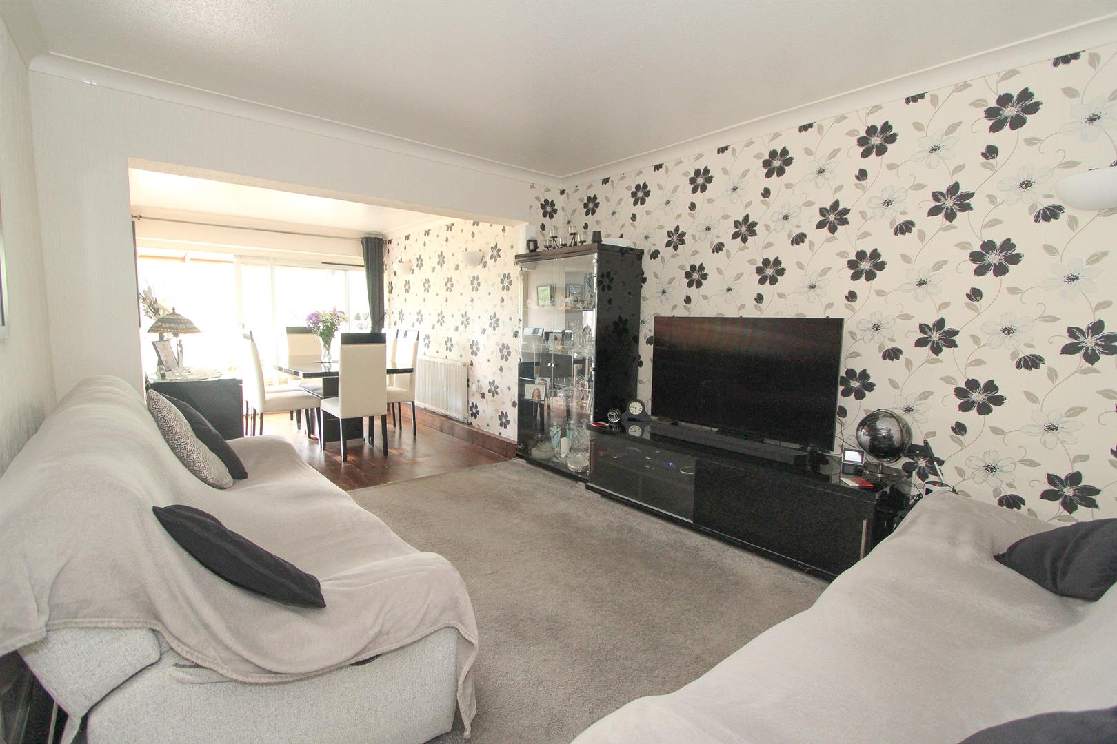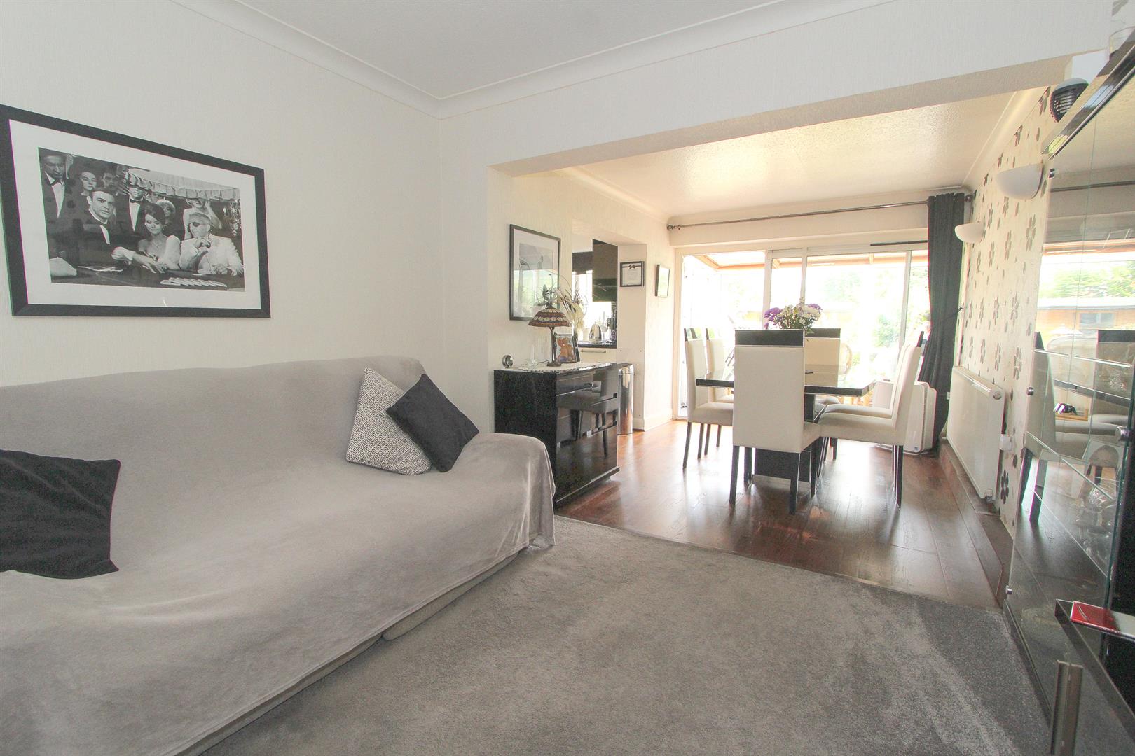 Wood laminate flooring, single panel radiator, coved ceiling, wall lights, double glazed sliding doors to rear aspect and arch way to..