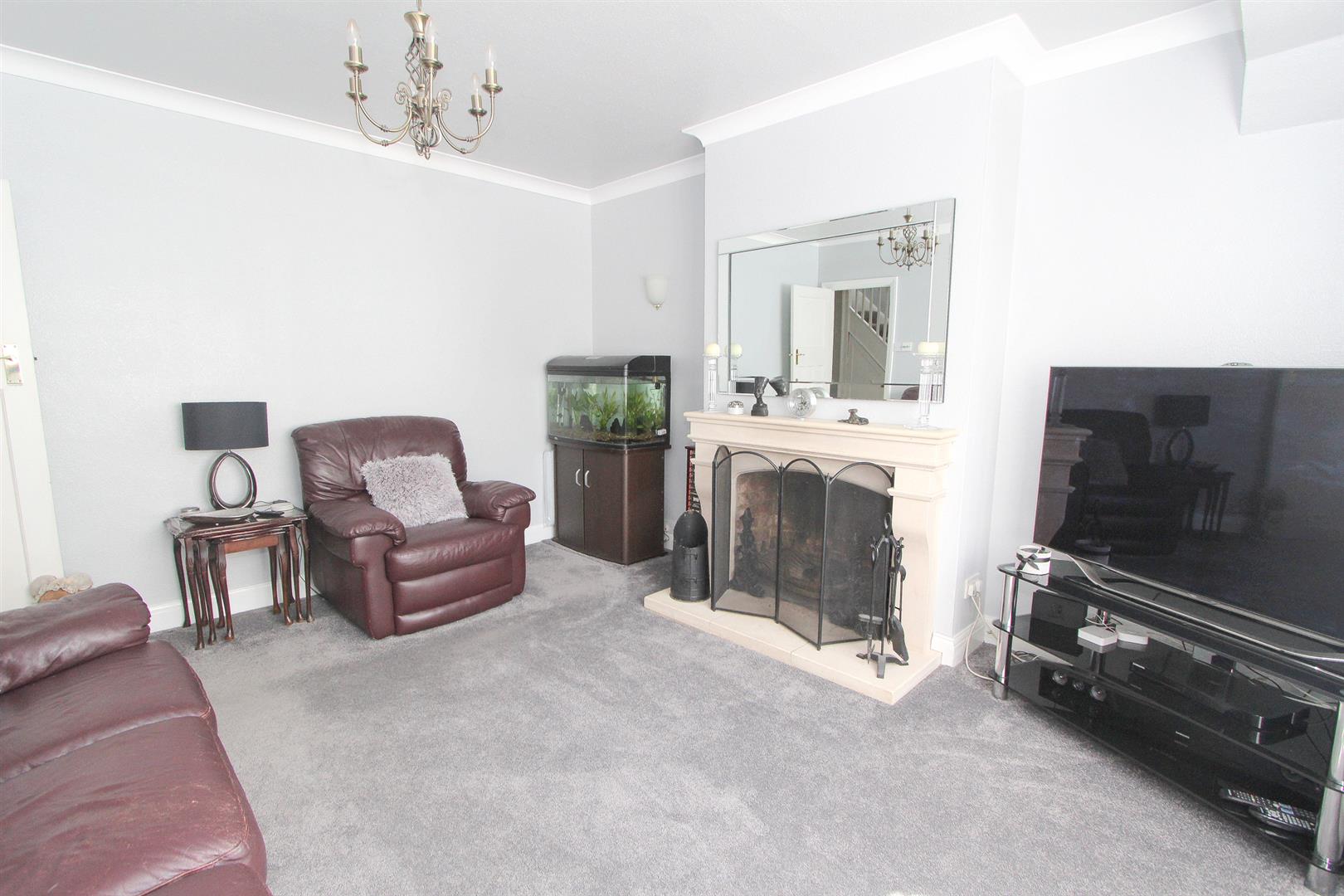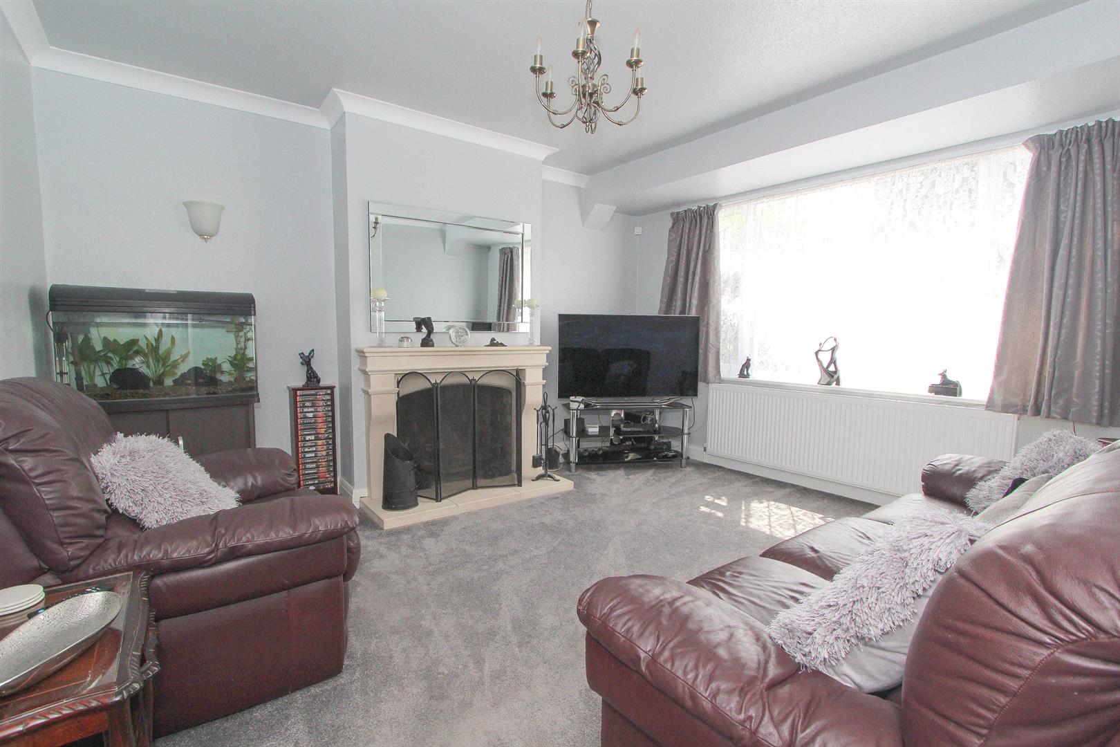 Large UPVC double glazed window to front aspect, double panel radiator, open fireplace with solid , coved ceiling, wall lights.