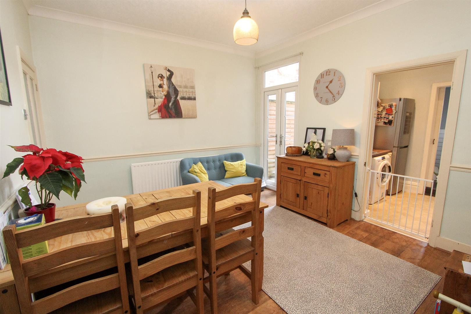 Laminate flooring, radiator, understairs storage cupboard, double glazed patio doors leading out to garden.
