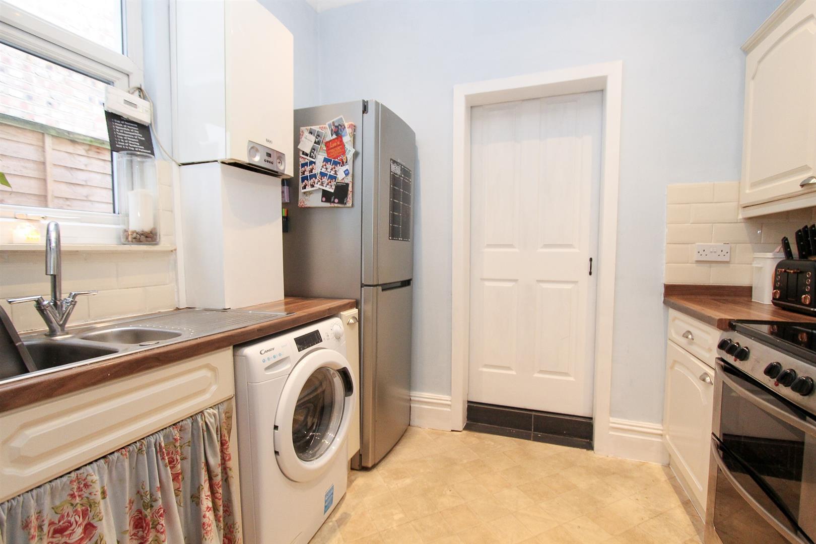 Range of fitted kitchen units and doors, laminate worktop, inset one and a half bowl stainless steel sink with chrome mixer tap, space for cooker with extractor fan above, space for washing machine and fridge freezer, wall mounted boiler, tiled splashback, vinyl flooring, double glazed window to side aspect.