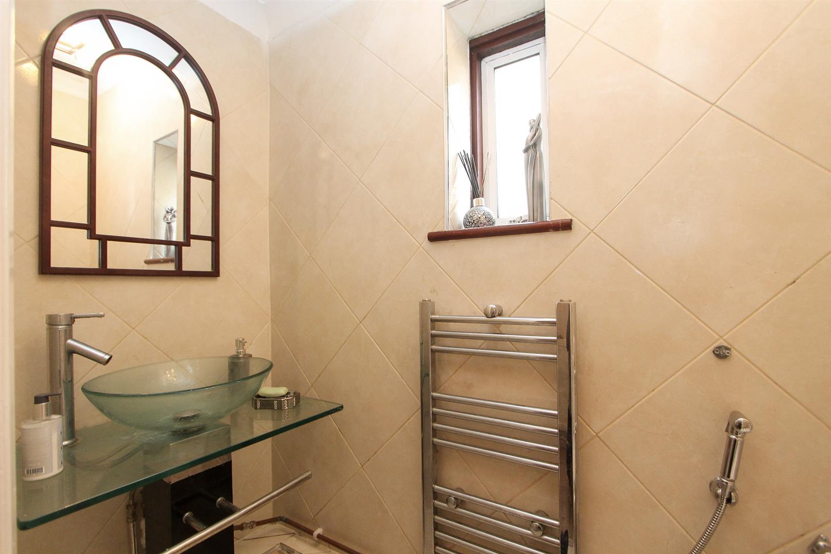 WC, wash hand basin with chrome mixer tap, heated chrome towel rail, tiled walls and flooring, double glazed obscure window to side aspect