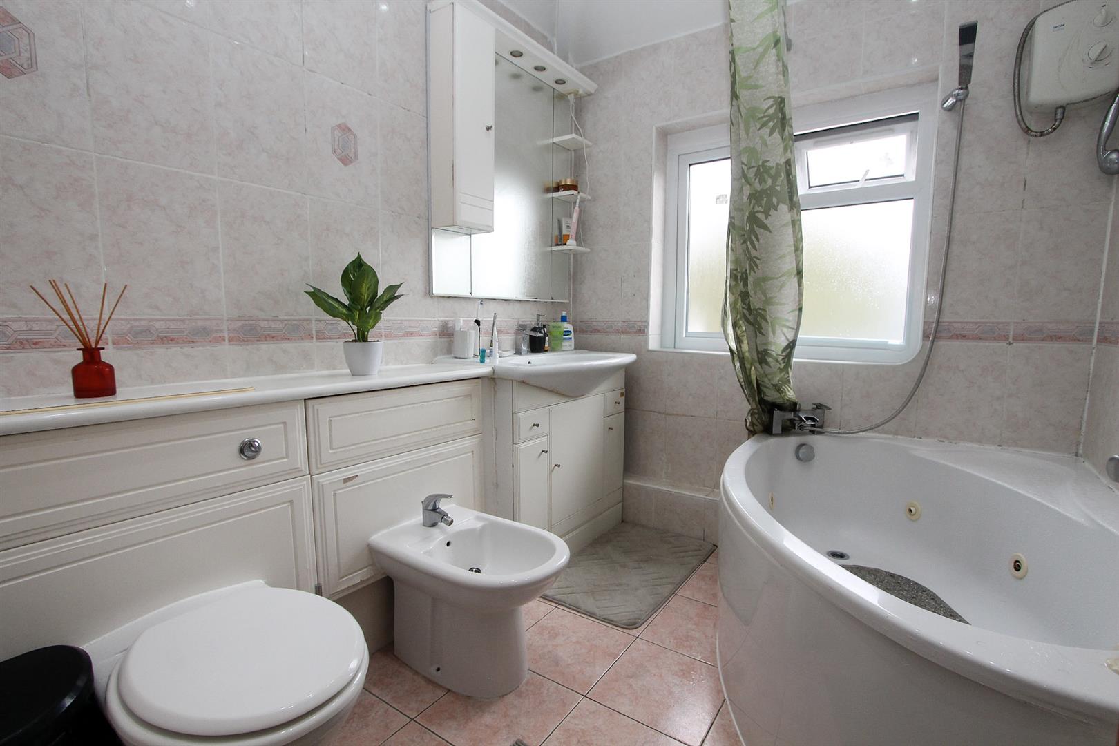Jacuzzi bath with chrome mixer tap and hand shower attachment, vanity wash hand basin with chrome mixer tap and storage below, enclosed WC, bidet, extractor fan, tiled walls and flooring, double glazed obscure window to rear aspect.