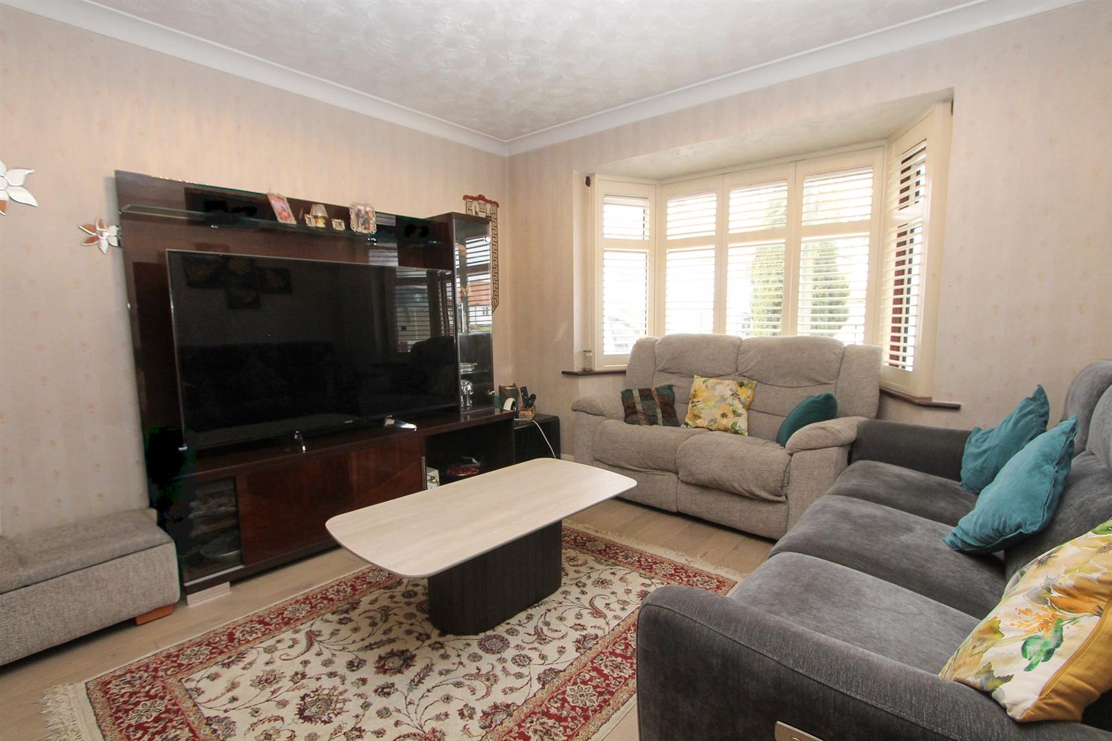 Laminate flooring, double glazed bay window to front aspect with fitted shutters, radiator, double doors opening out to kitchen/breakfast room
