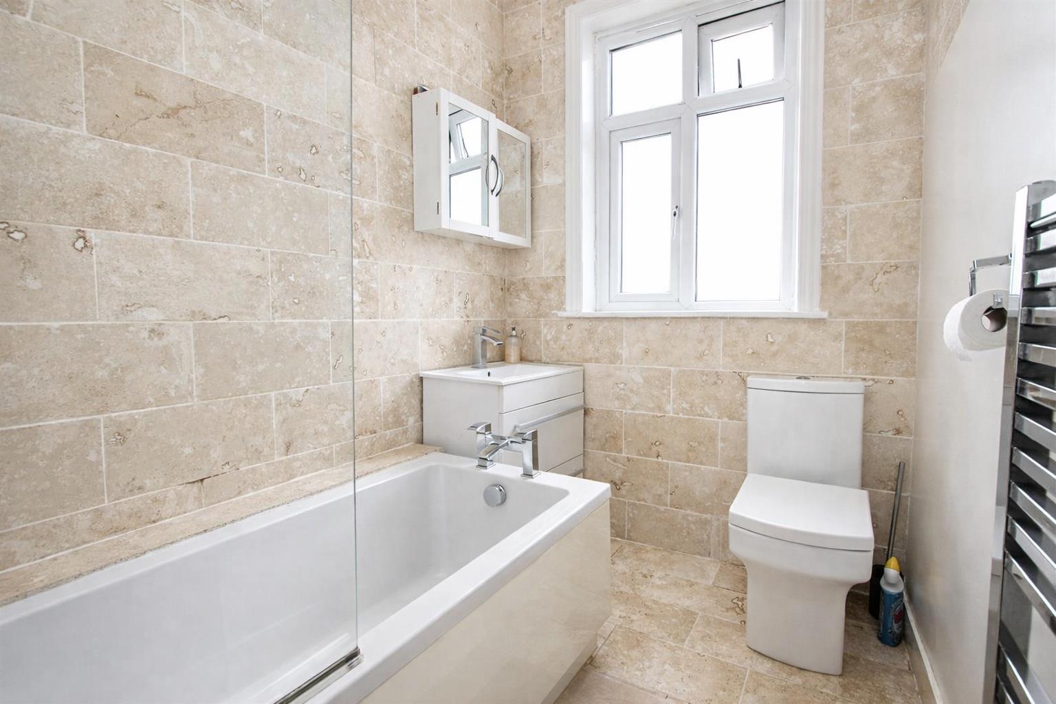Three-piece suite comprising panel enclosed bath with shower screen, chrome mixer tap and showerhead attachment, vanity wash hand basin with chrome mixer tap and storage below, WC, heated chrome towel, part tiled walls, tiled flooring, double glazed secure window to rear aspect.
