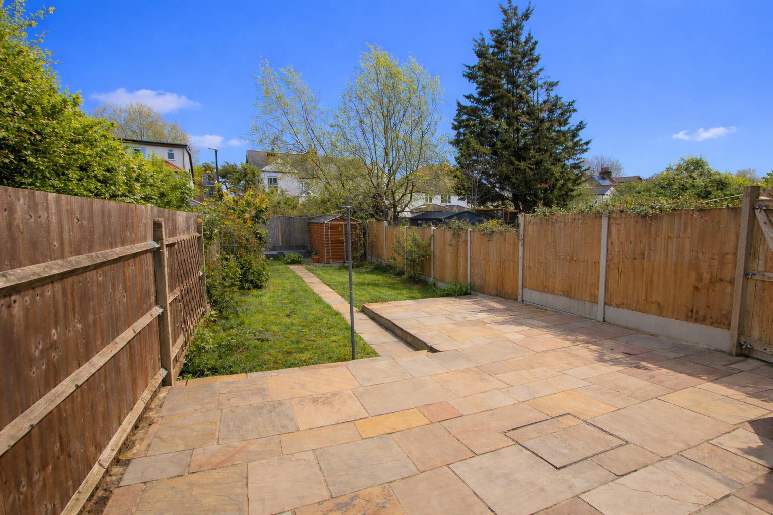Paved patio area, lawn section, shed, power socket, gate providing side access.