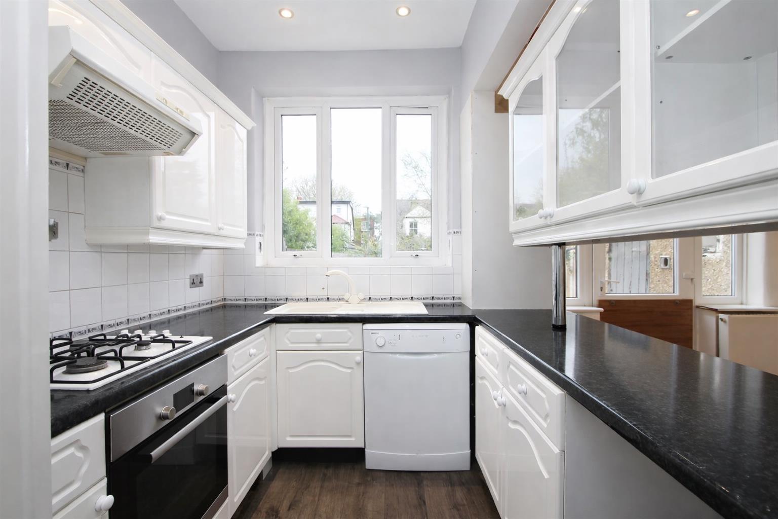 Range of fitted kitchen units and drawers, laminate worktop, inset one and a half bowl sink with mixer tap, integrated oven, gas hob and extractor fan above, space and plumbing for dishwasher, space for undercounter fridge freezer, tiled splashback, double glazed window to rear aspect