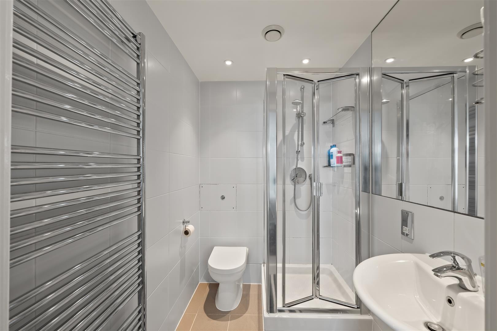 Comprising a shower cubicle with glass surround and handheld shower, a wall-mounted WC, and a wash hand basin with chrome mixer tap. Finished with a heated wall-mounted mirror, grey floor tiles, and a chrome heated towel rail.