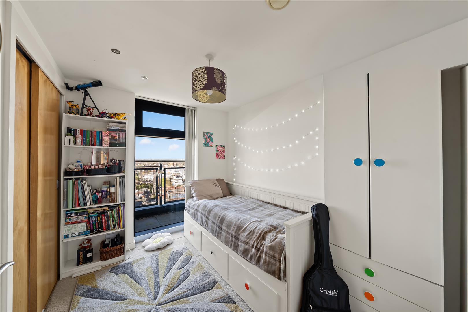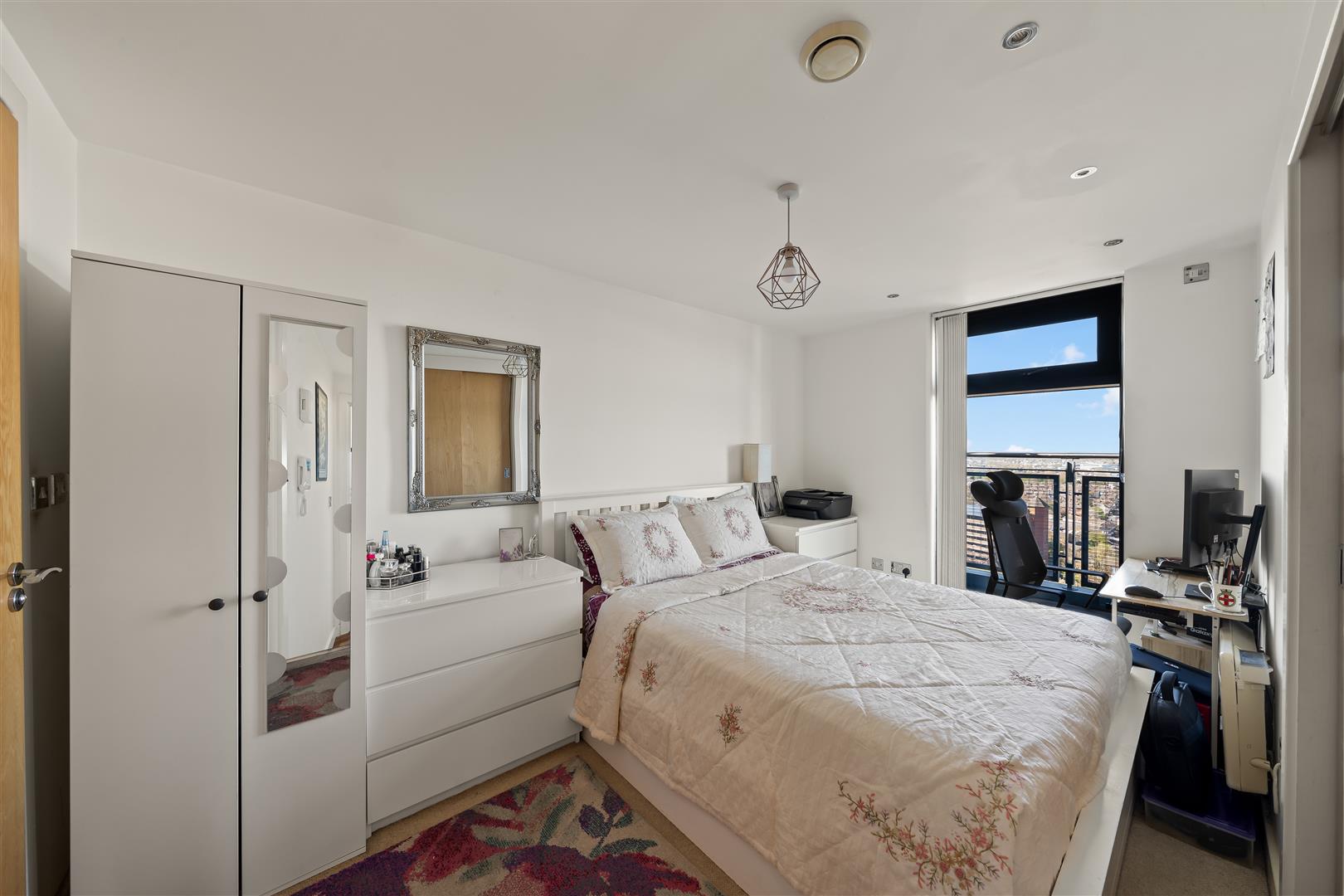 Carpet, built-in wardrobe, and impressive floor-to-ceiling windows.