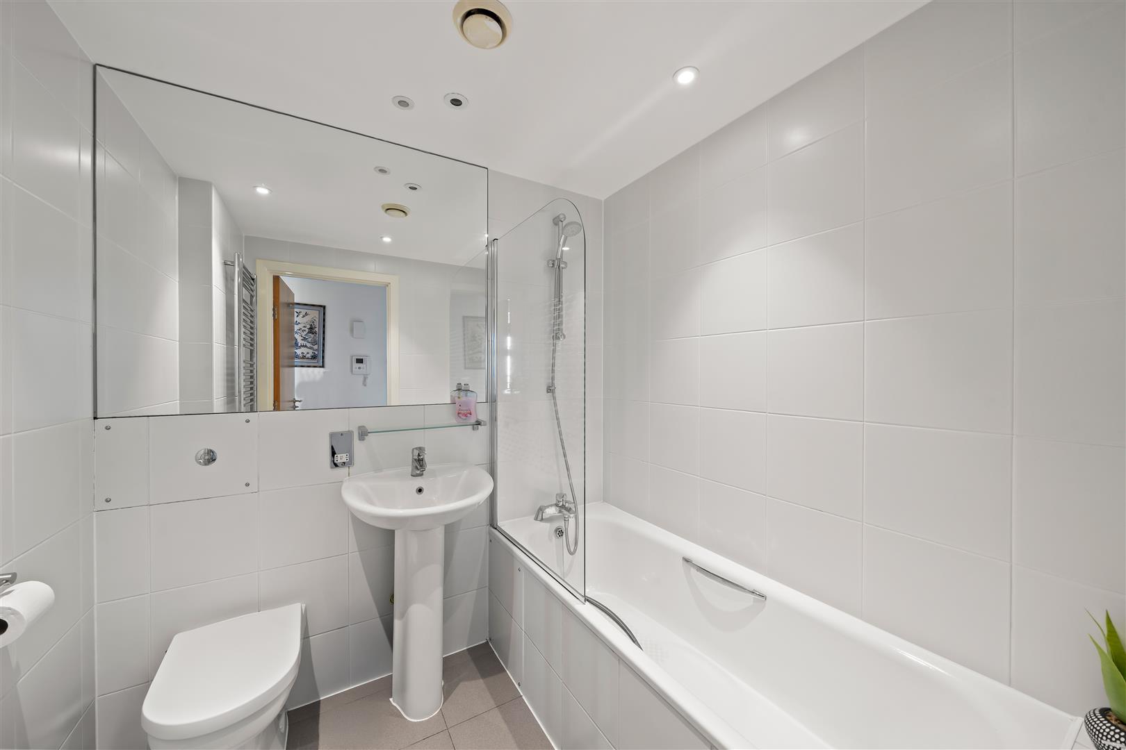 Modern suite comprising a wall-mounted WC, wash hand basin with chrome mixer tap, and a bath with overhead chrome mixer shower and glass screen. Finished with grey floor tiles, grey tiled walls, a heated wall-mounted mirror and glass shelf above the sink, and a chrome heated towel rail.