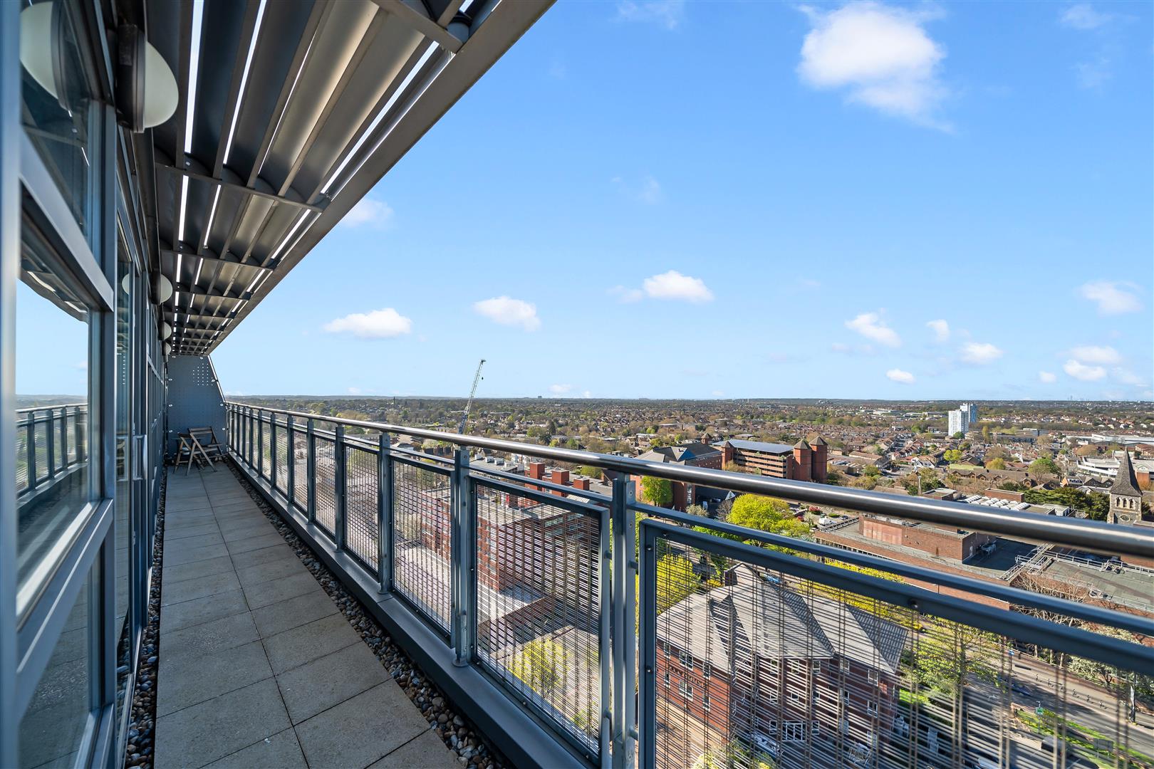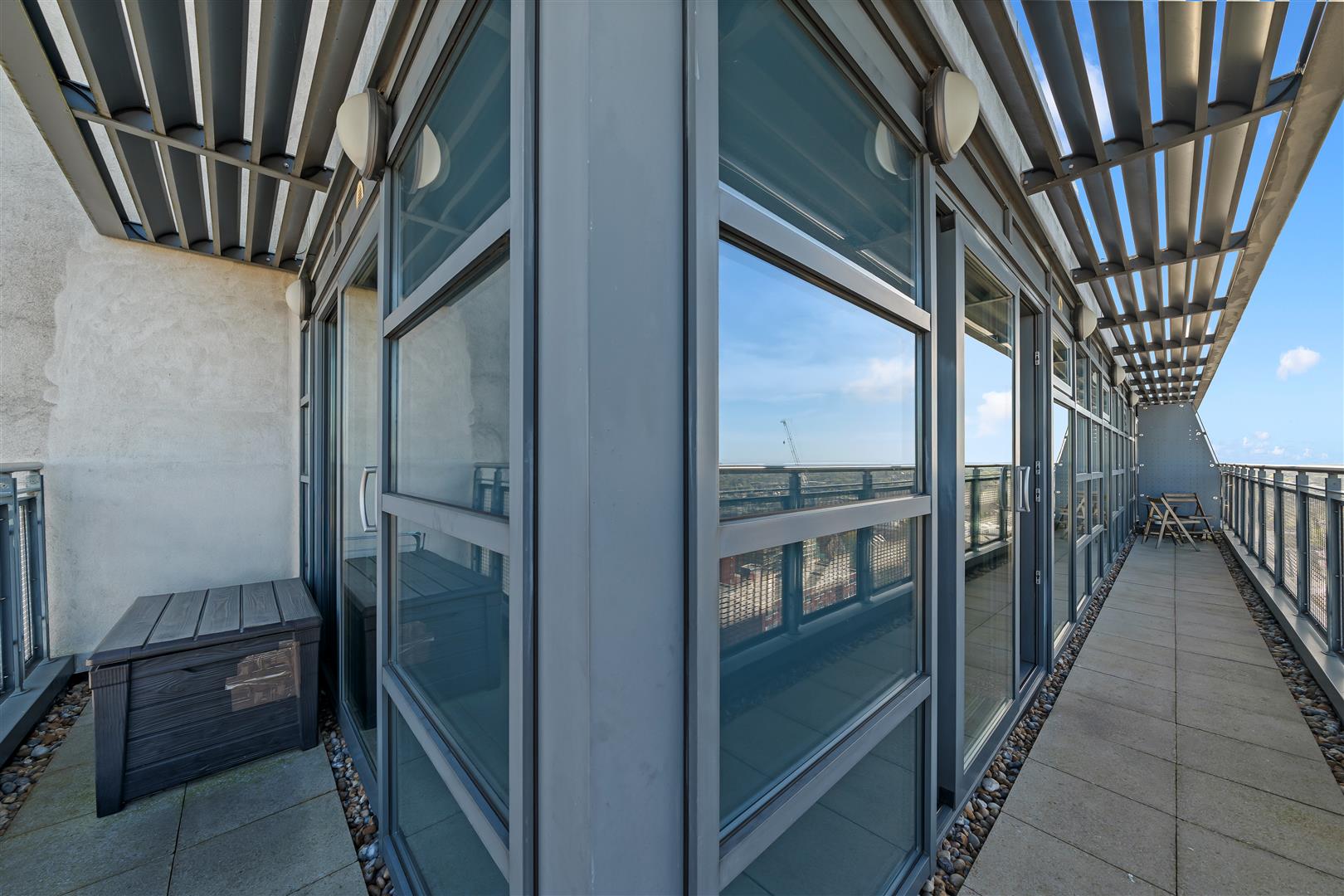 Impressive wrap-around balcony finished with concrete tiles and neatly edged gravel borders, offering incredible panoramic skyline views across London.