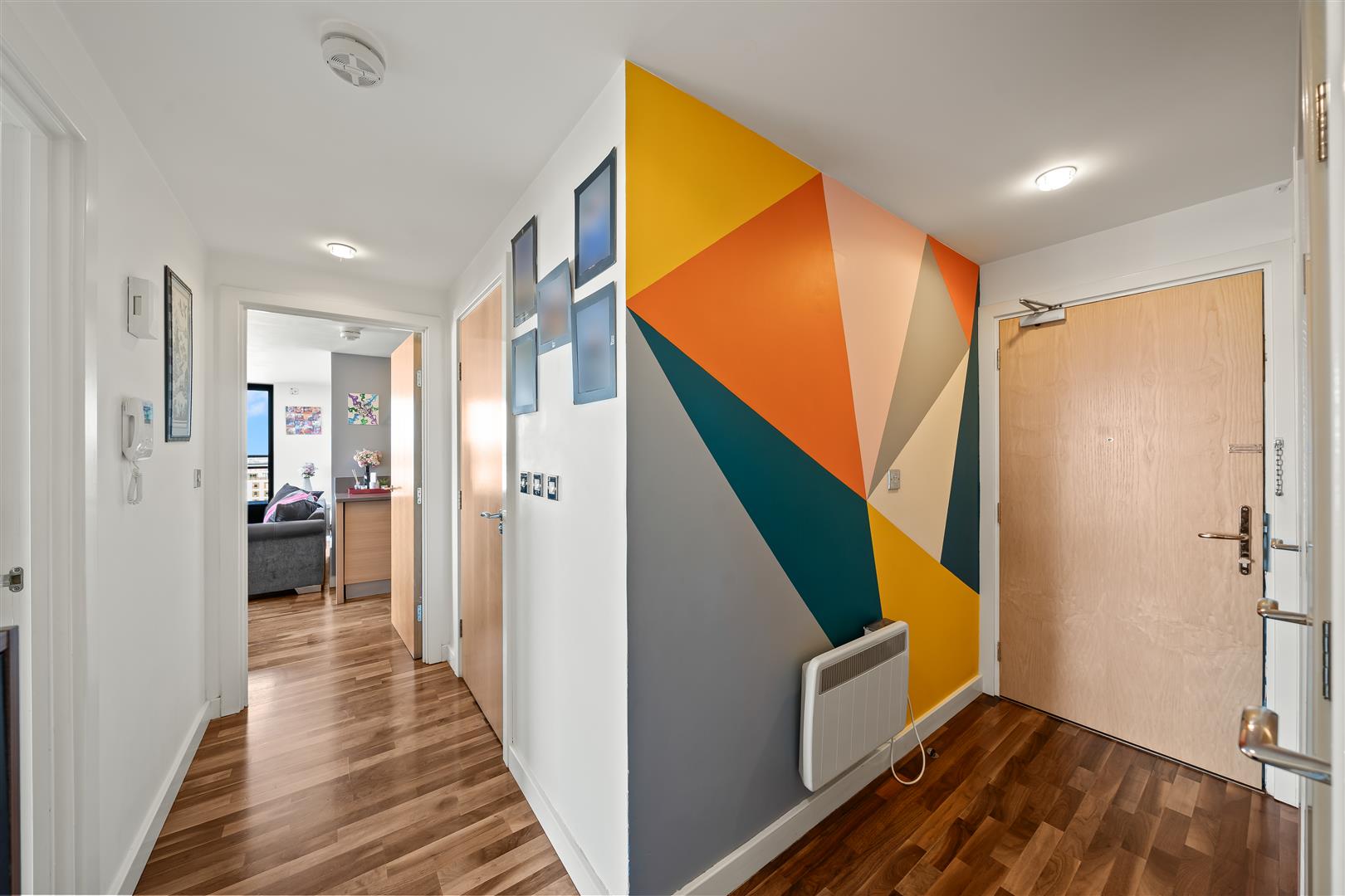 Featuring wooden flooring, an electric heater and three storage cupboards housing the boiler, washing machine and a cloakroom.