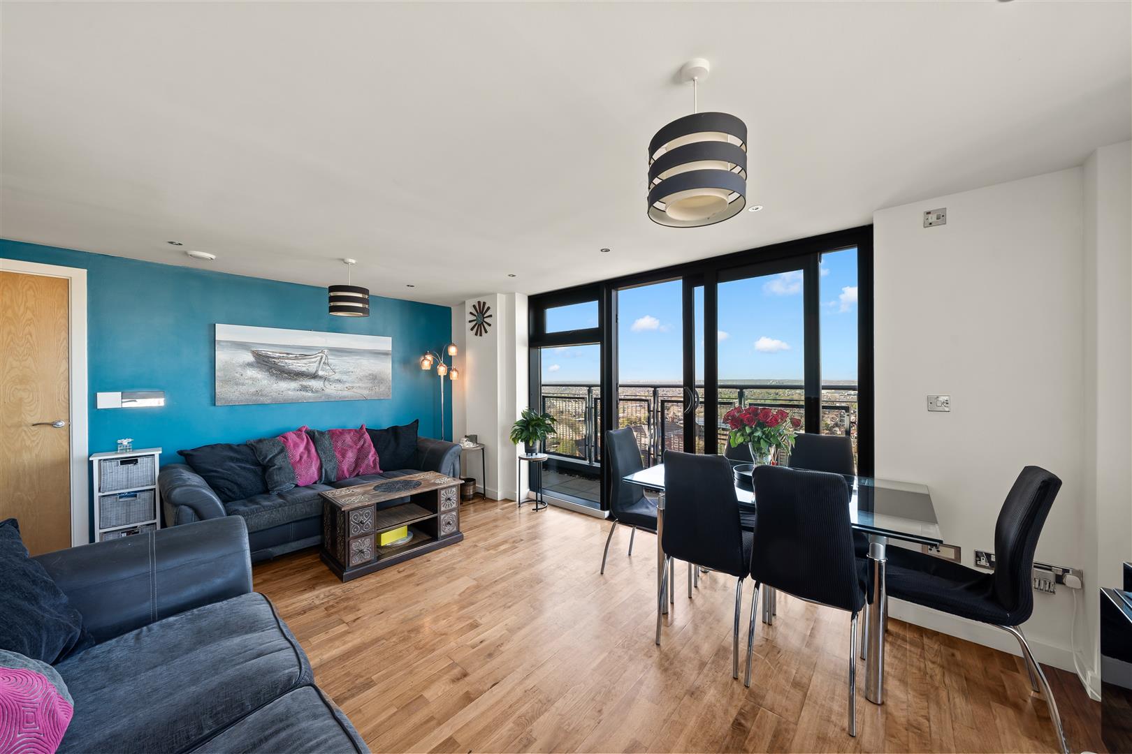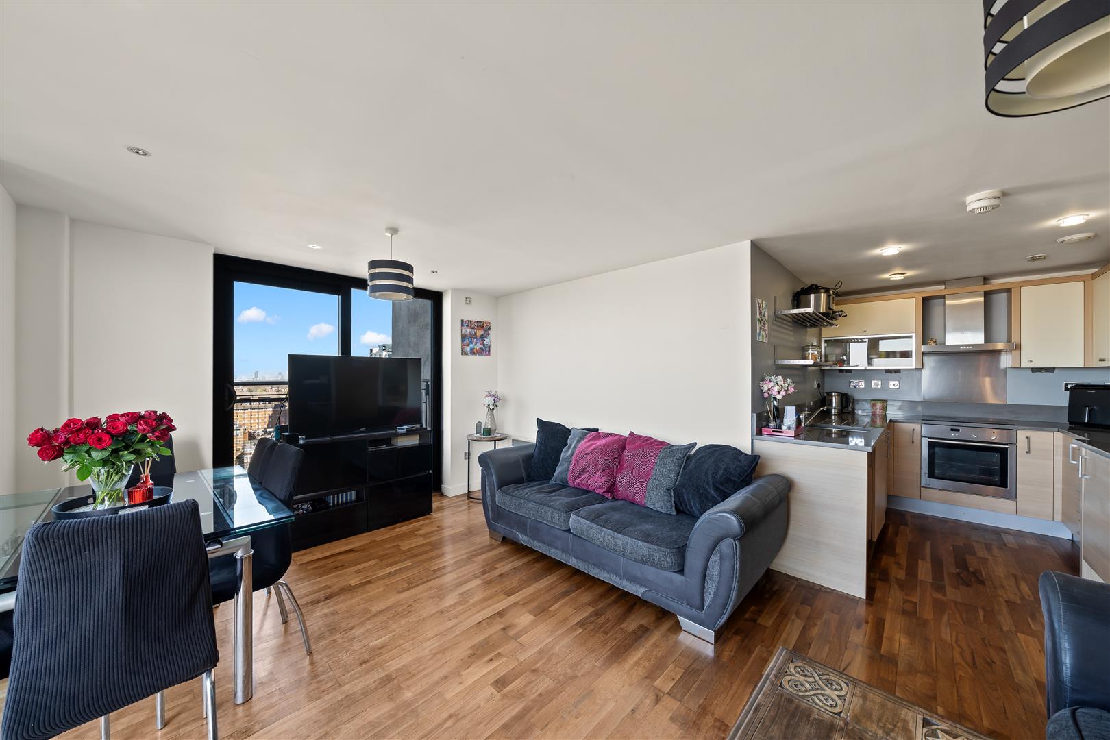 Bright and spacious open-plan living area with wooden flooring, seamlessly flowing into the kitchen. Featuring impressive floor-to-ceiling windows and finished with two ceiling light fittings and spotlights.