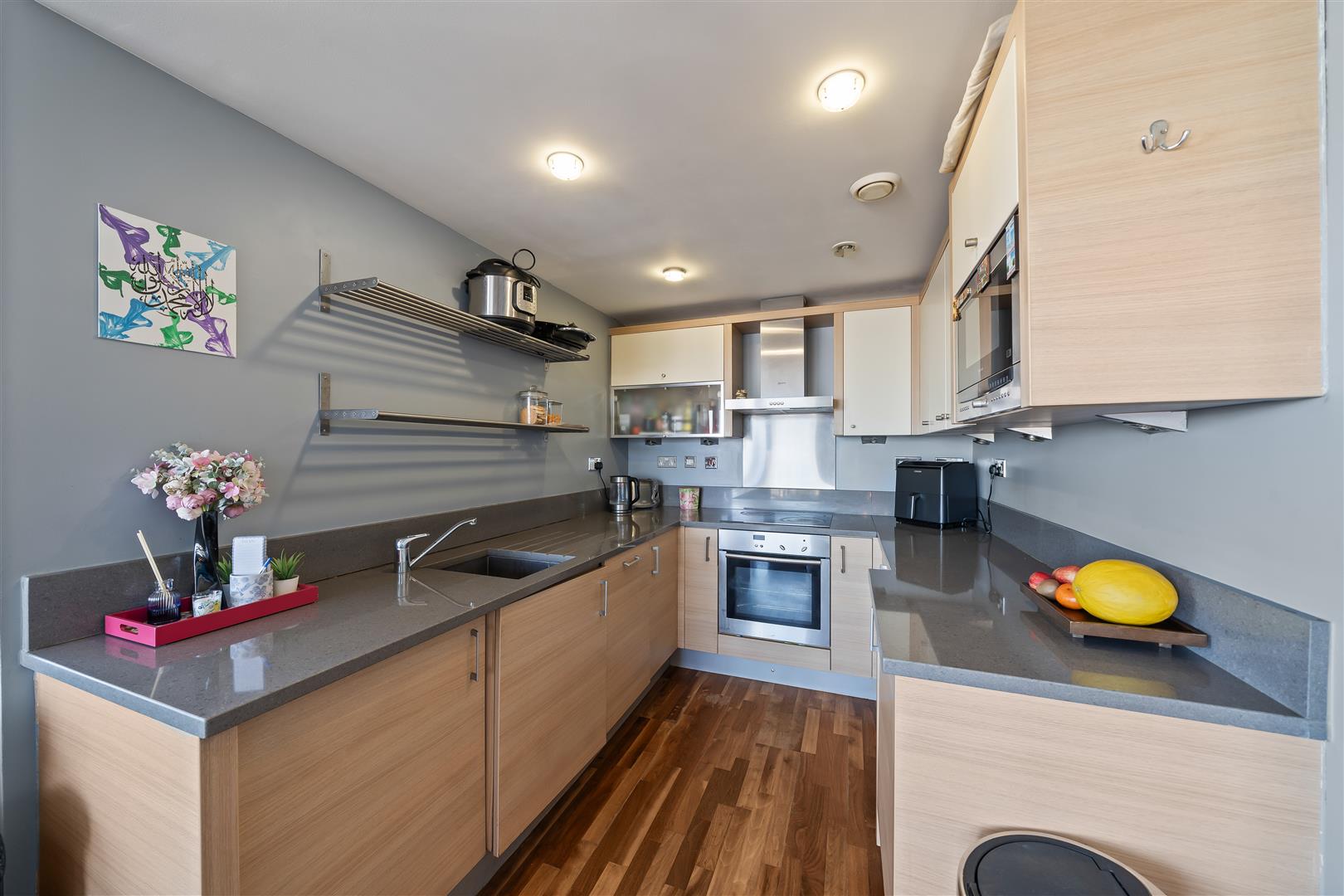Fully fitted modern kitchen featuring integrated appliances including a fridge, freezer, microwave, dishwasher, and an induction hob with oven and extractor fan above. Finished with grey marble worktop surfaces, grey wall and cream base units providing ample storage and stylish wooden flooring.