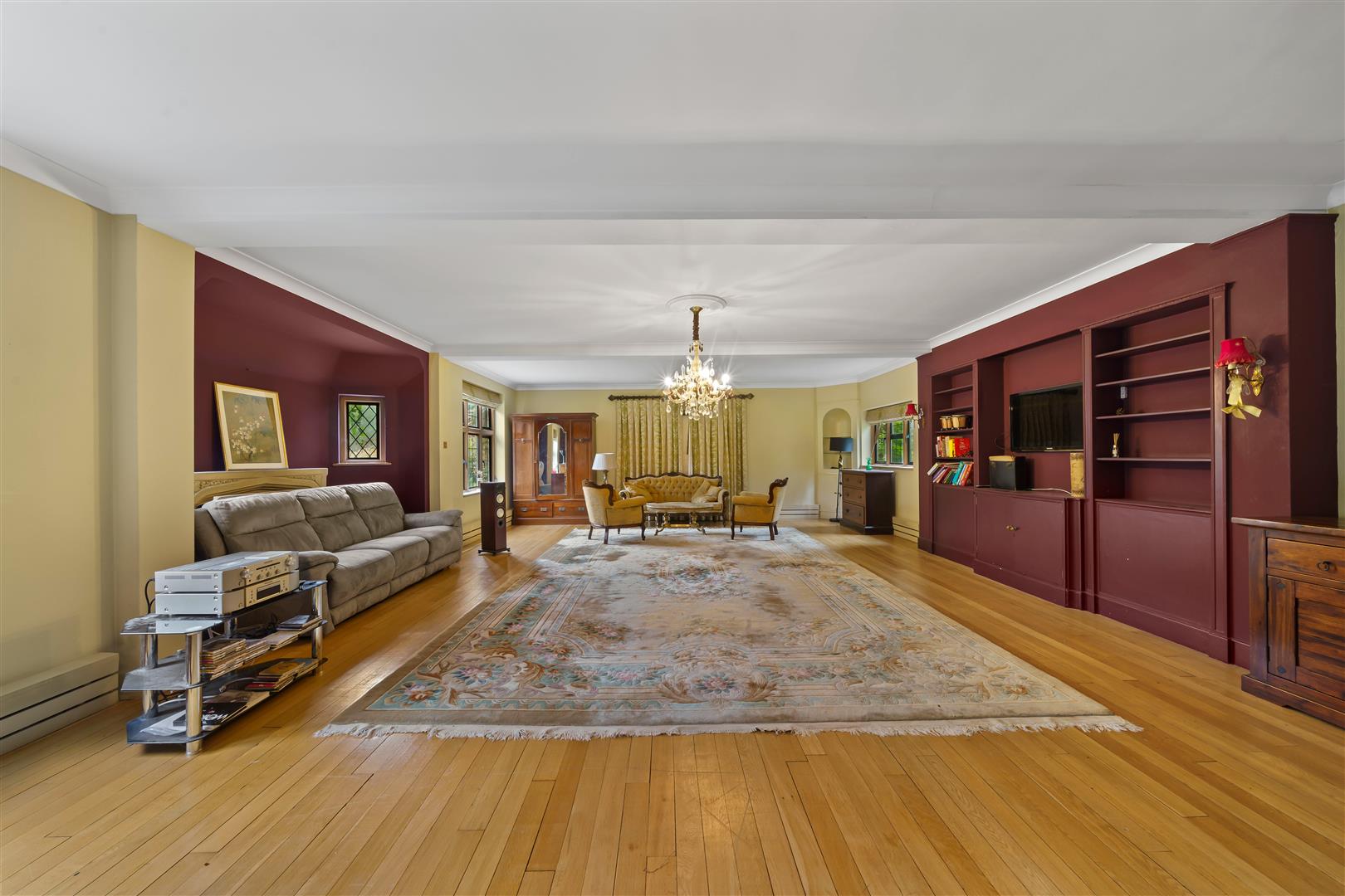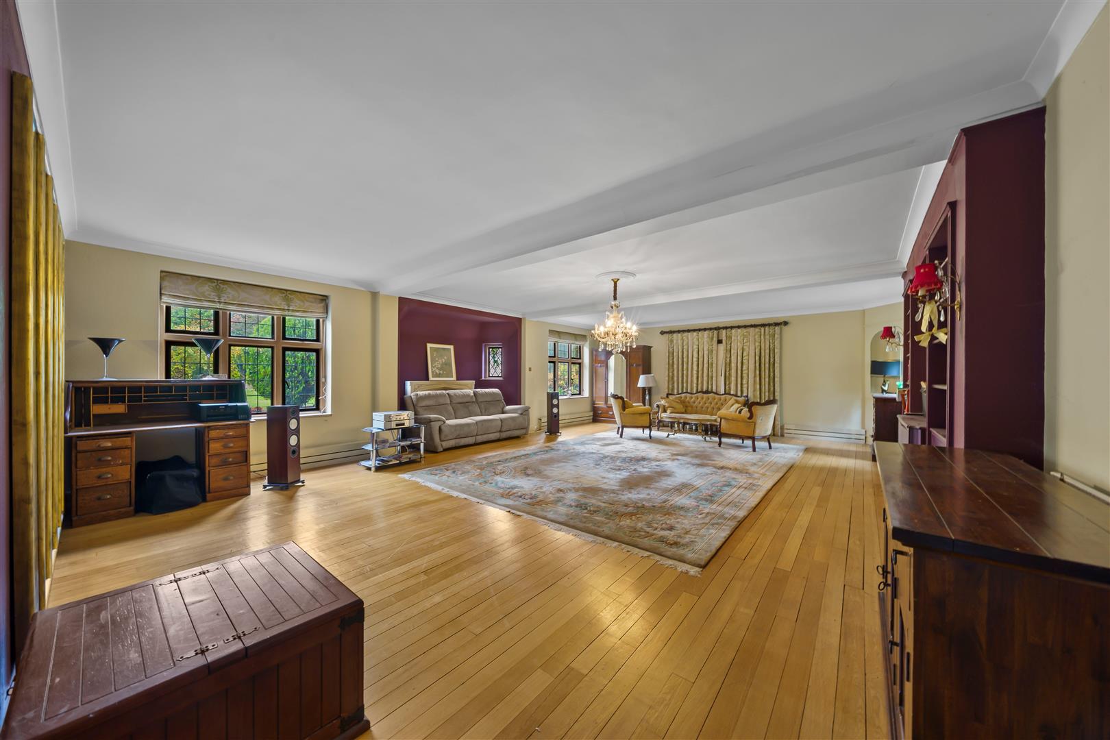 Double glazed leaded light windows to front side and rear aspects, fitted shelving and media wall with storage cupboards, solid wood flooring, coved ceiling and ceiling rose, fireplace with stone surround, covered radiators.
