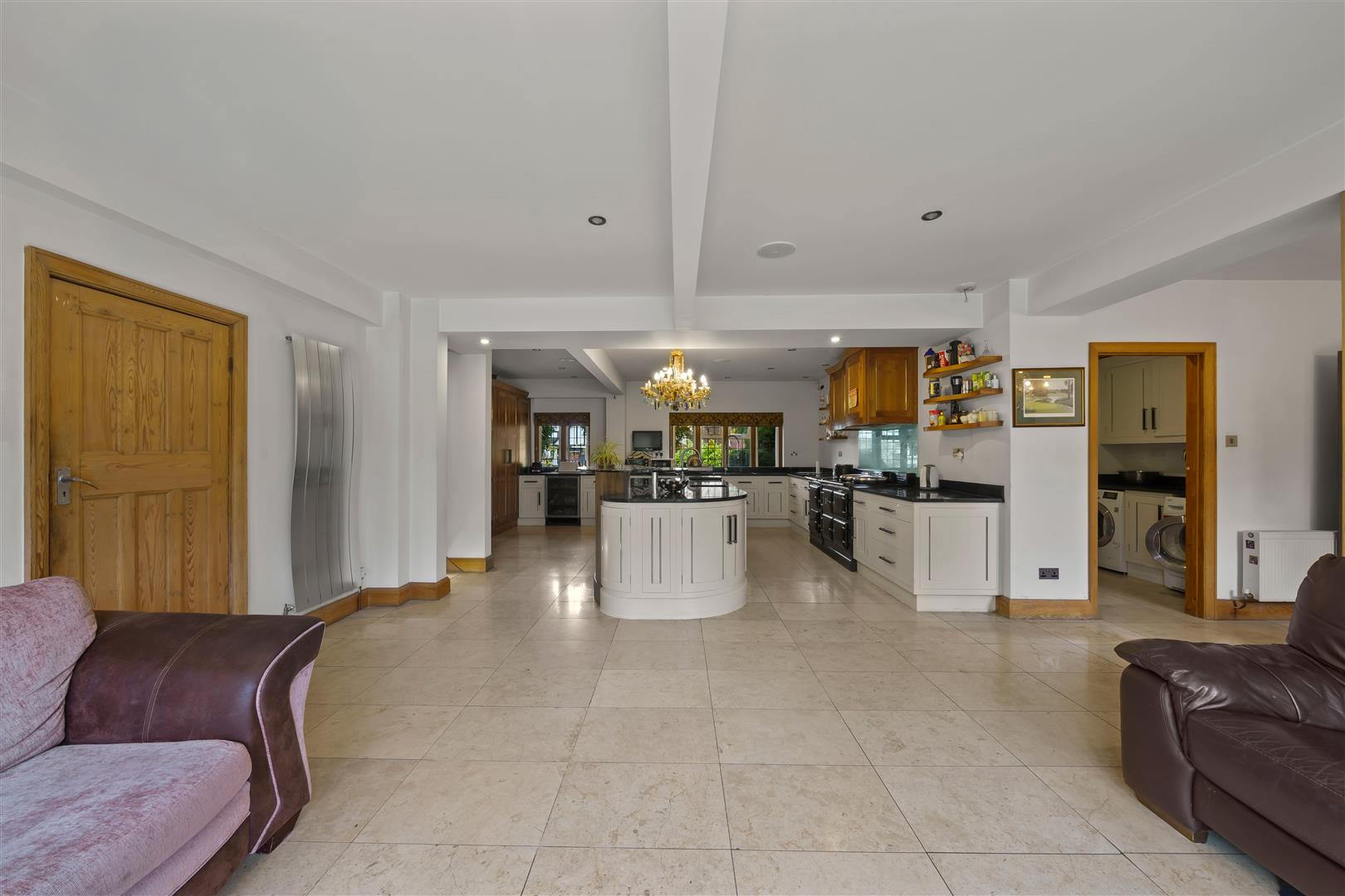 Bespoke fitted kitchen with range of wall units and cupboards below, granite worktops with inlaid stainless steel sink and chrome mixer tap with hose attachment, Aga with extractor fan above, integrated wine cooler, integrated fridge and freezer, integrated oven/grill and coffee machine, island with breakfast bar and inlaid stainless steel sink with brushed chrome mixer tap, integrated dishwasher, double glazed light windows to front aspect and bi folding doors to rear, modern radiator, tiled flooring.