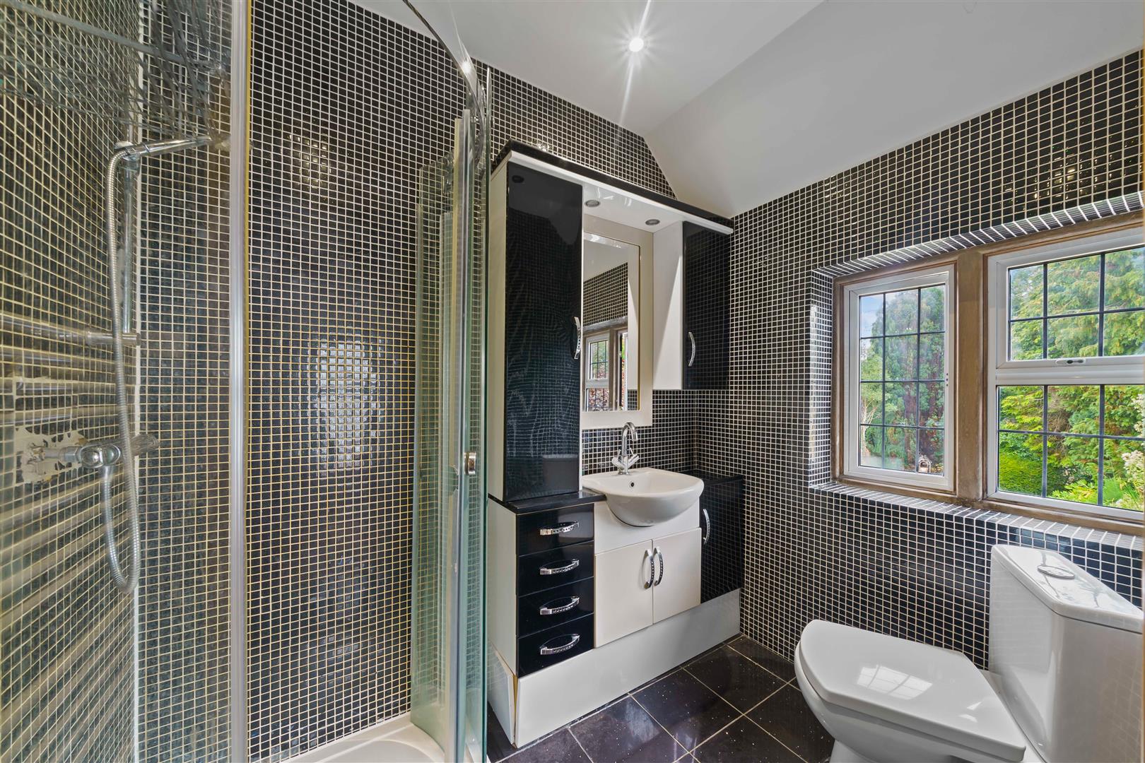 Spacious luxury suite consisting of tiled walk in cubicle with thermostatic shower and hand attachment, sunken bath with chrome mixer tap and fitted TV unit, large wash hand basin with chrome mixer tap and storage cupboards below, low-level push button flush WC, heated towel rail, double glazed windows to front and side aspects, extractor fan.