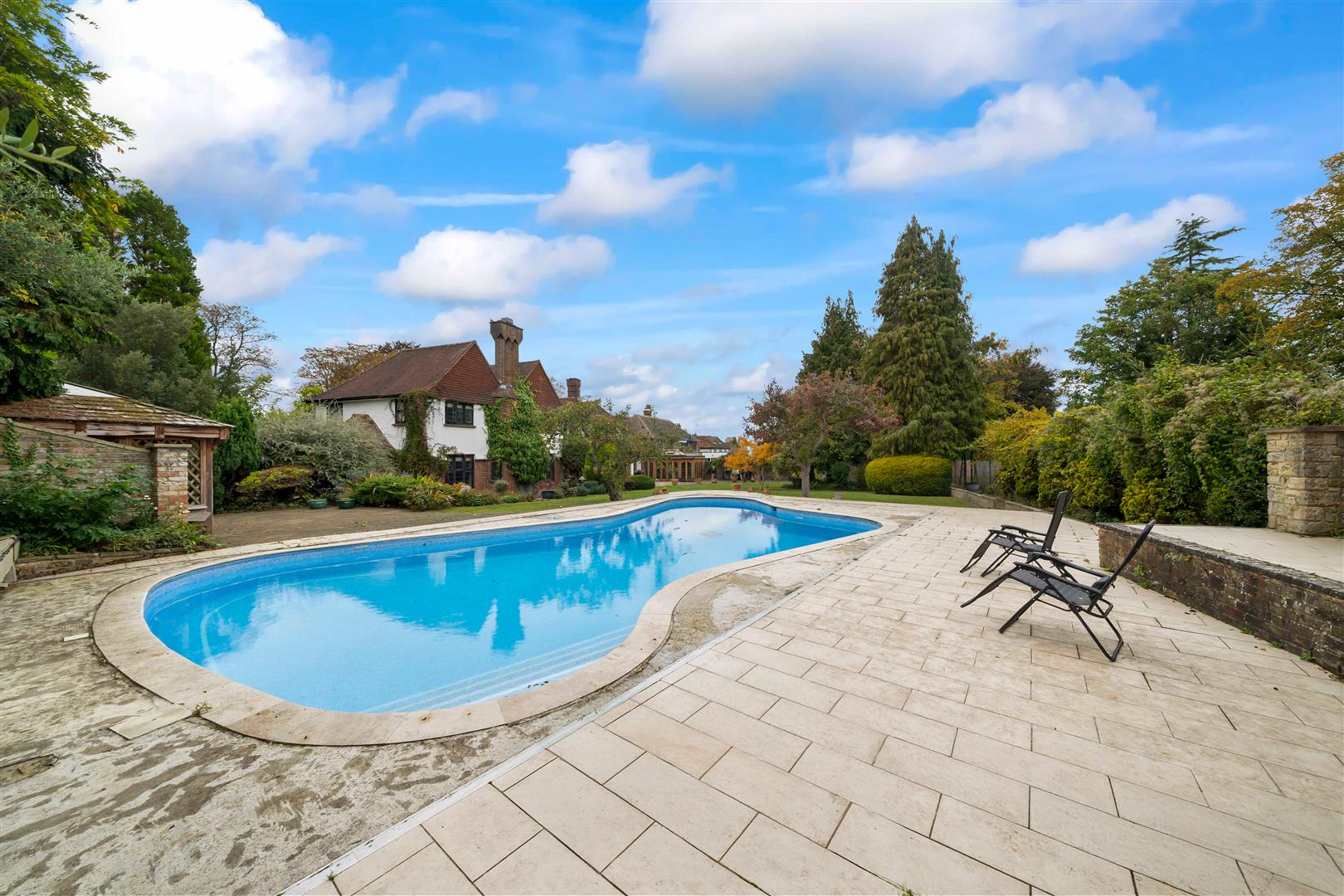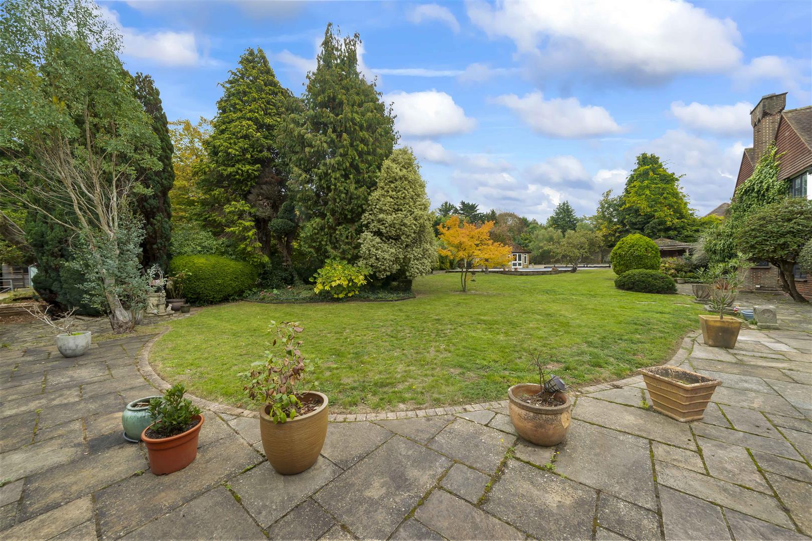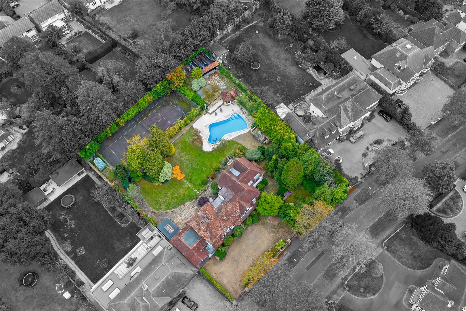 Large Indian sandstone paved patio area and footpath at side, access to tennis courts, sheltered Jacuzzi and gated side access with further patio area, mainly laid to lawn with mature shrubs and plants bordering, sheltered Jacuzzi area, swimming pool and detached brick built pool house.