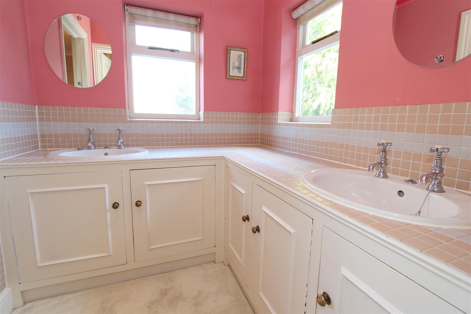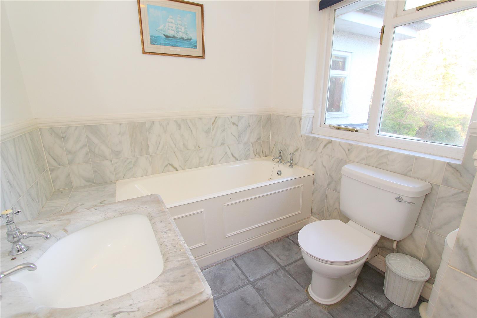 Comprising panel enclosed bath with taps and thermostatic shower, low-level push button flush WC, his and hers wash hand basin with chrome taps and storage cupboards below, windows to side and rear aspects, shaver point, coved ceiling.