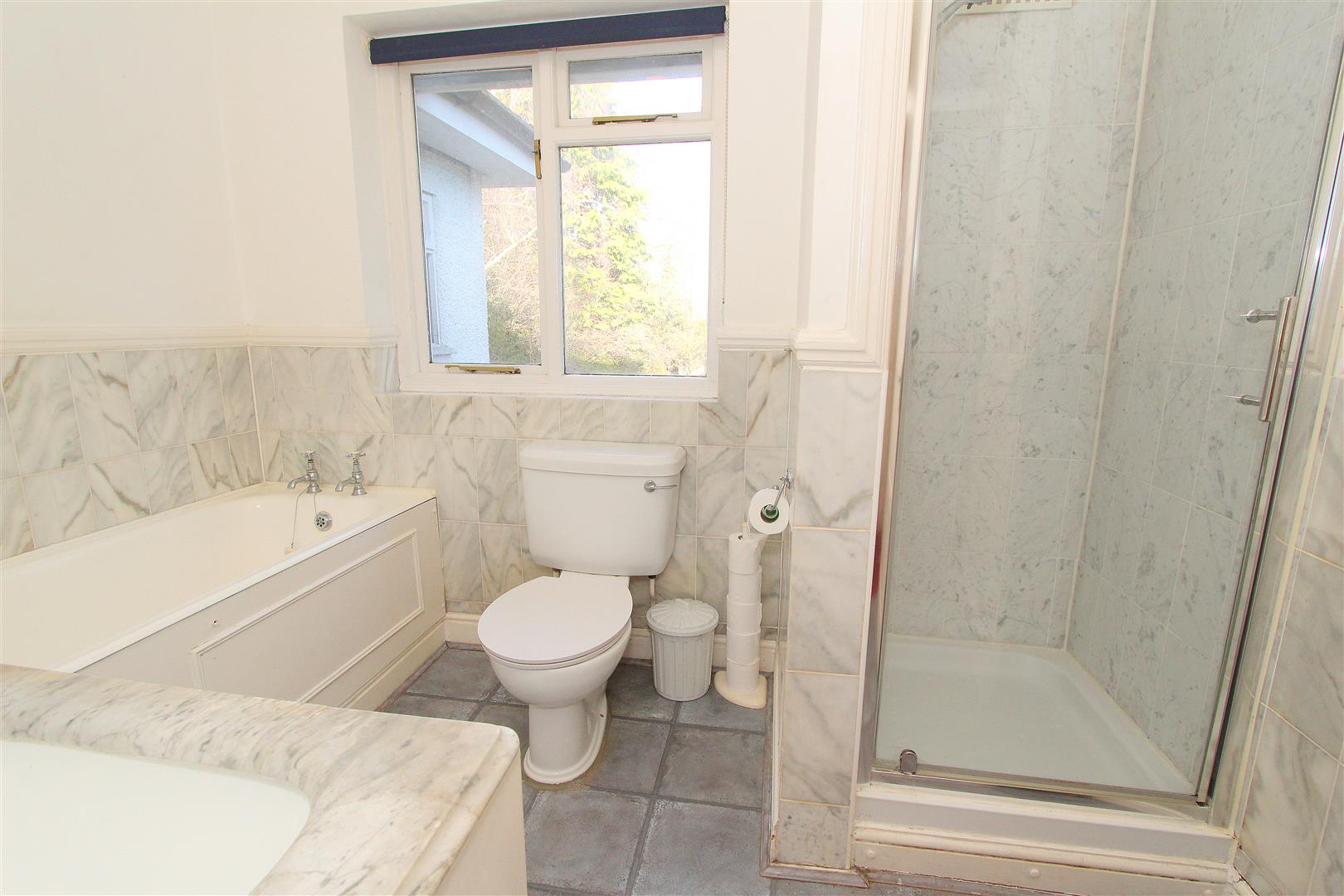 Four piece suite comprising bath with chrome taps, shower cubicle with pivot door and thermostatic shower, WC, wash hand basin, part tiled walls, vinyl tiled flooring, double glazed window to rear aspect, loft access hatch.