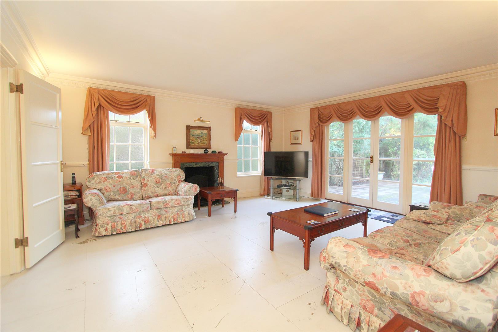 Obscure glazed windows to side aspect and patio doors leading to rear, covered radiator, open fireplace with wood mantle piece, decorative coved ceiling.