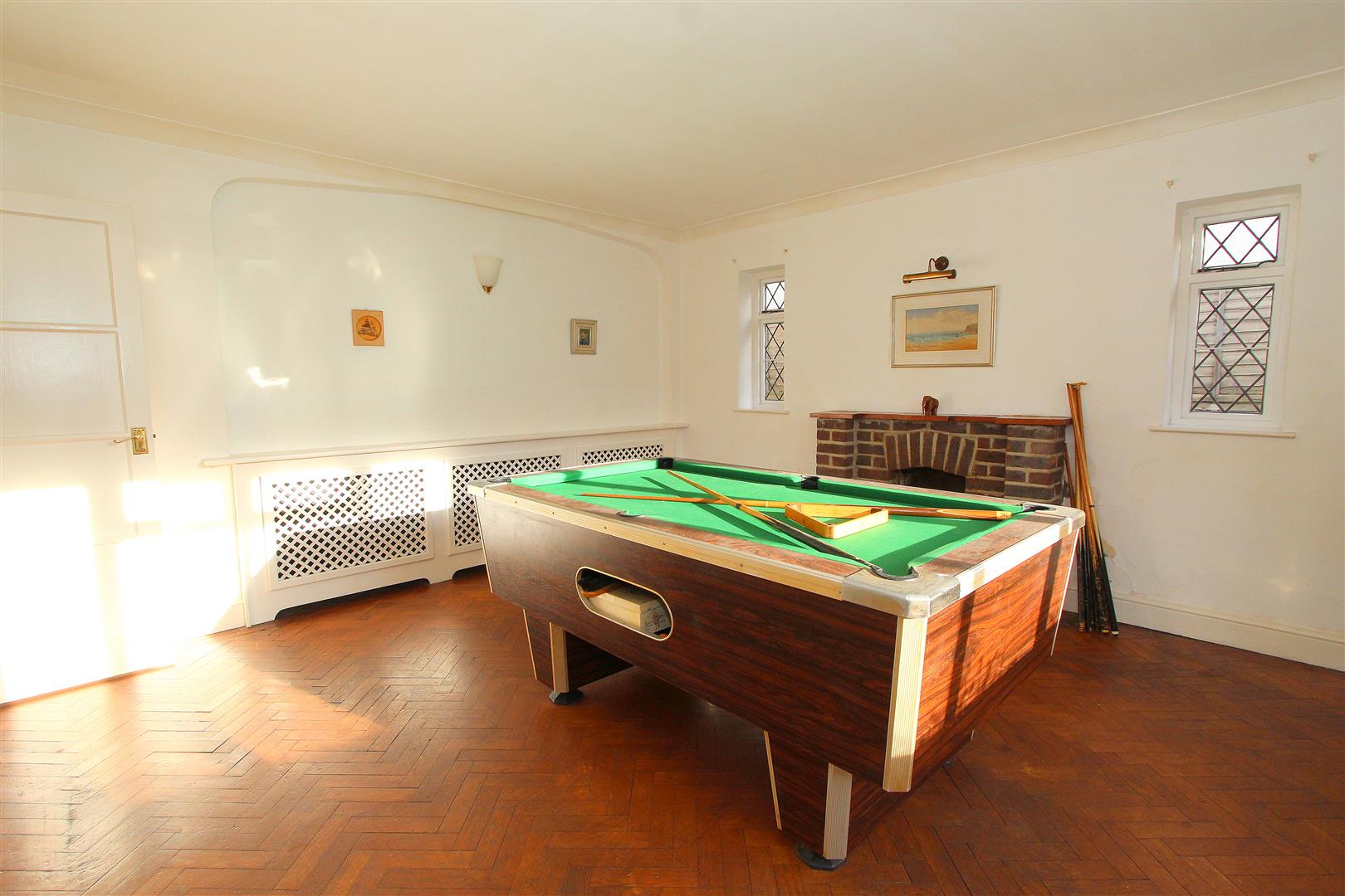 Double glazed window to front aspect and leaded light windows at side, open fireplace with bricks surround, herringbone parquet flooring, covered radiator, coved ceiling.