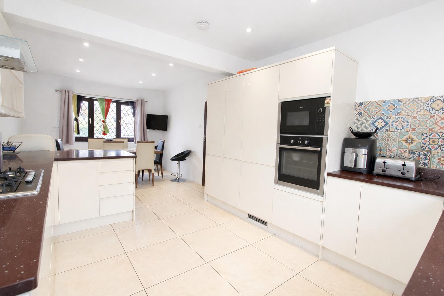 Range of fitted gloss wall units with matching cupboards and drawers below, quartz worktops with inlaid stainless steel sink and chrome mixer tap, integrated oven/grill/microwave, integrated dishwasher, inlaid gas hob with extractor fan above, UPVC double glazed window and door to rear aspect and further window at front, tiled flooring, double panel radiator, decorative tiled splash back.