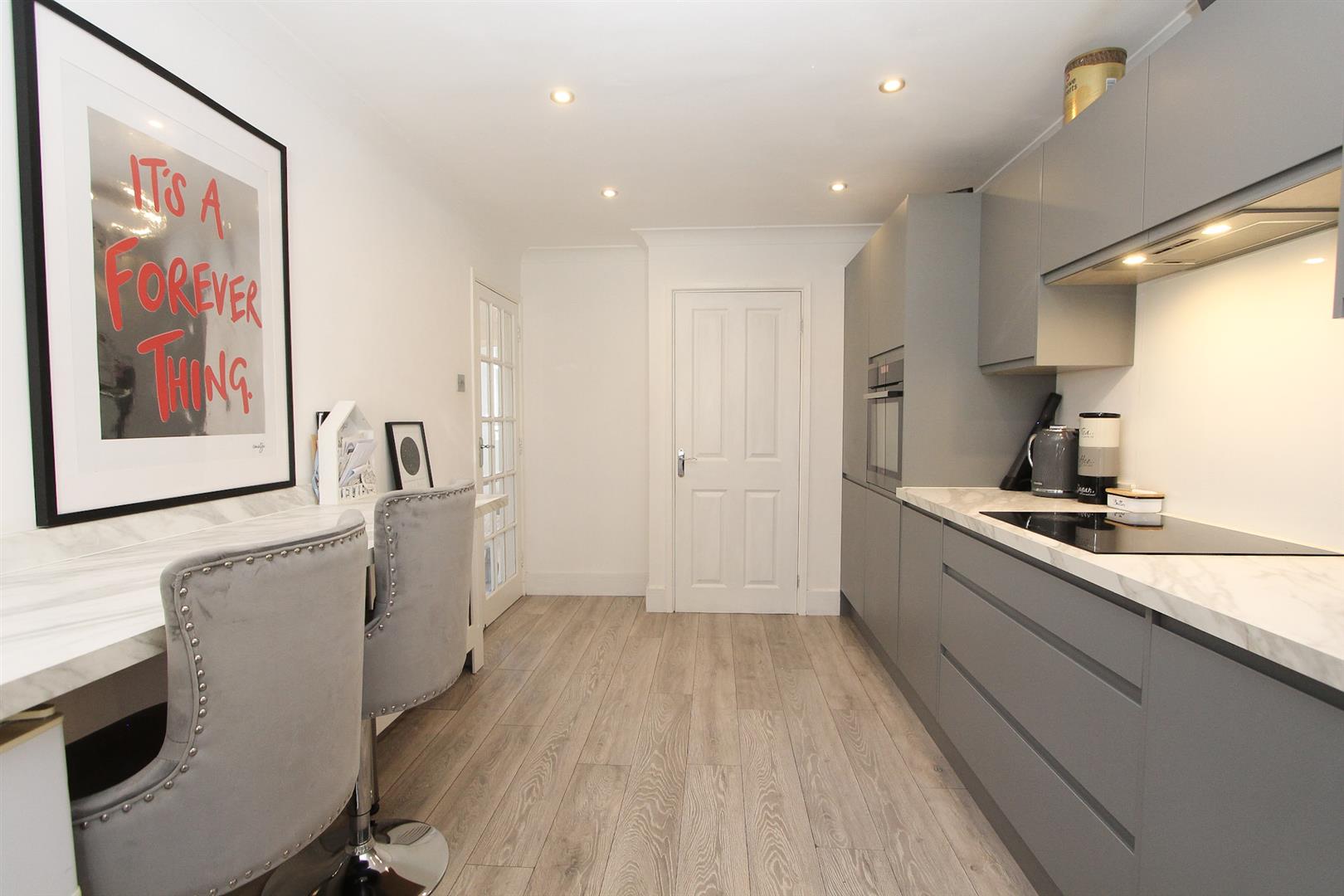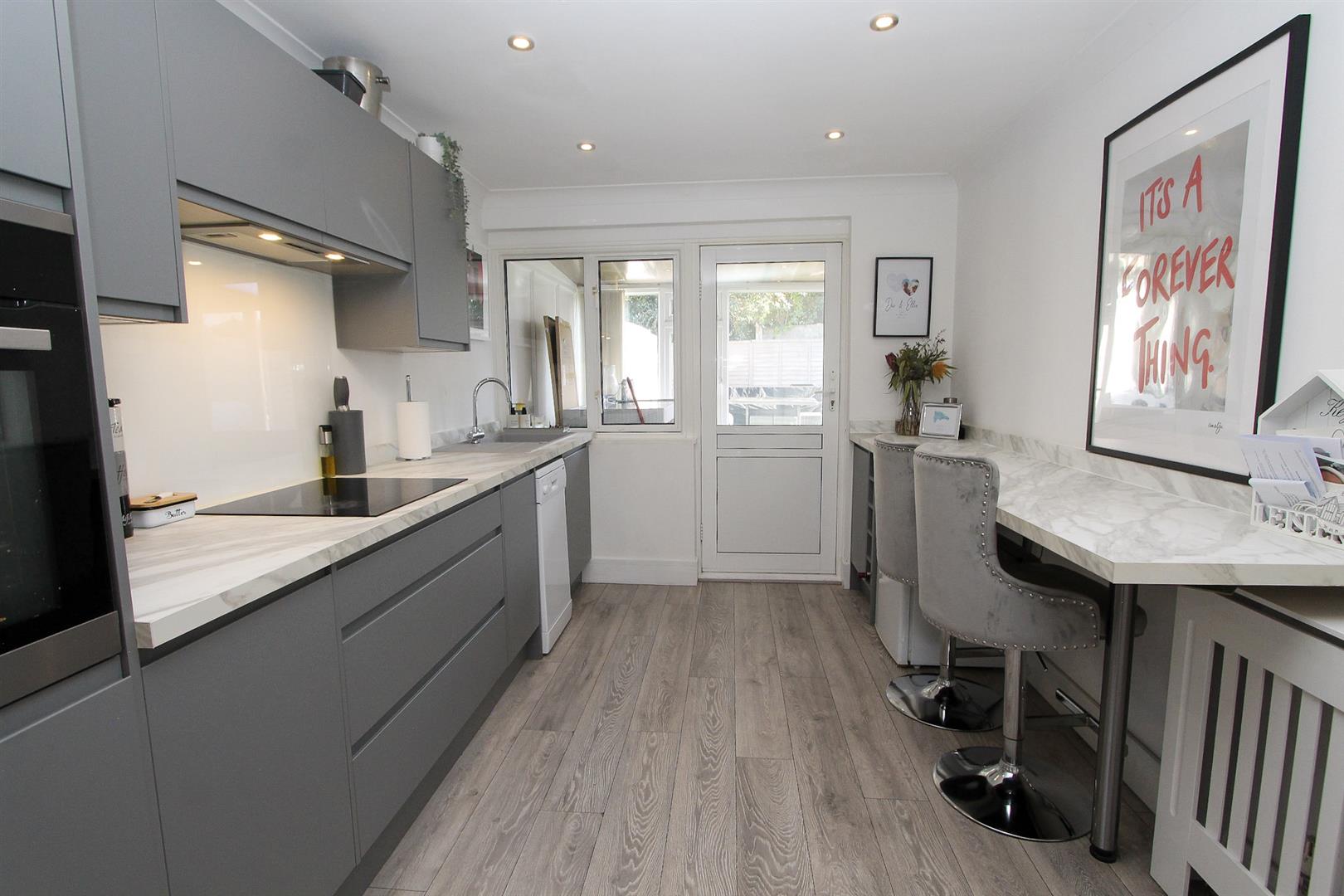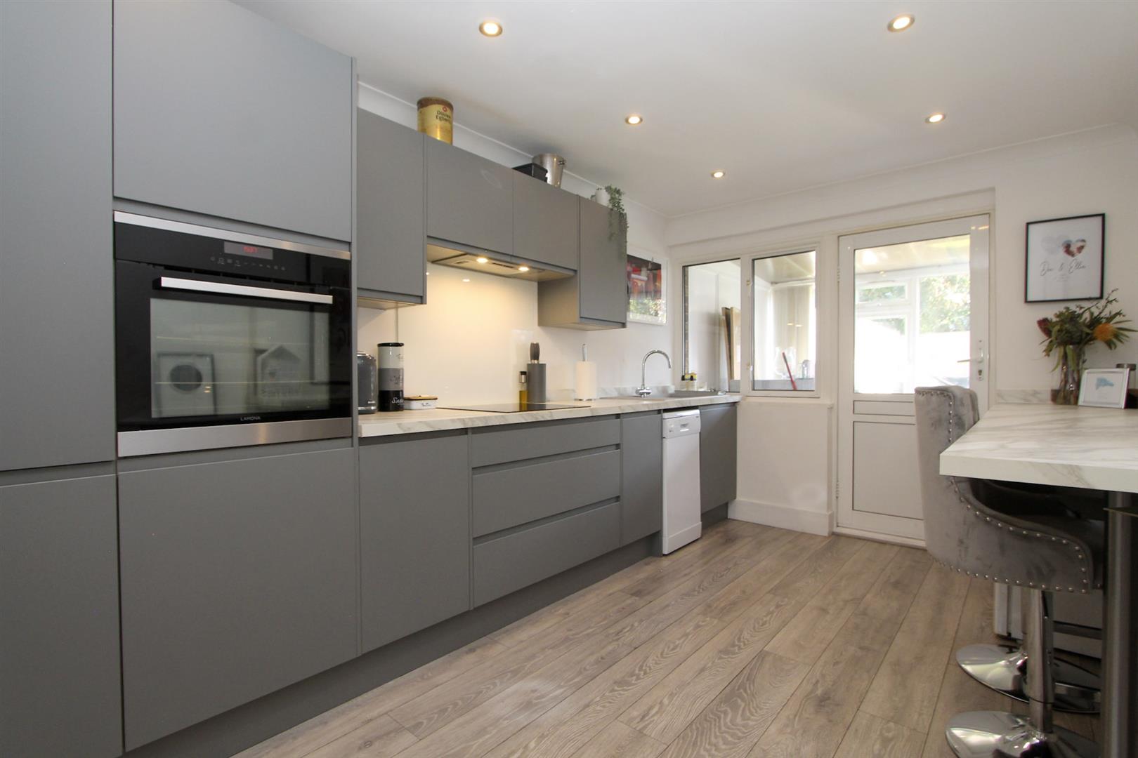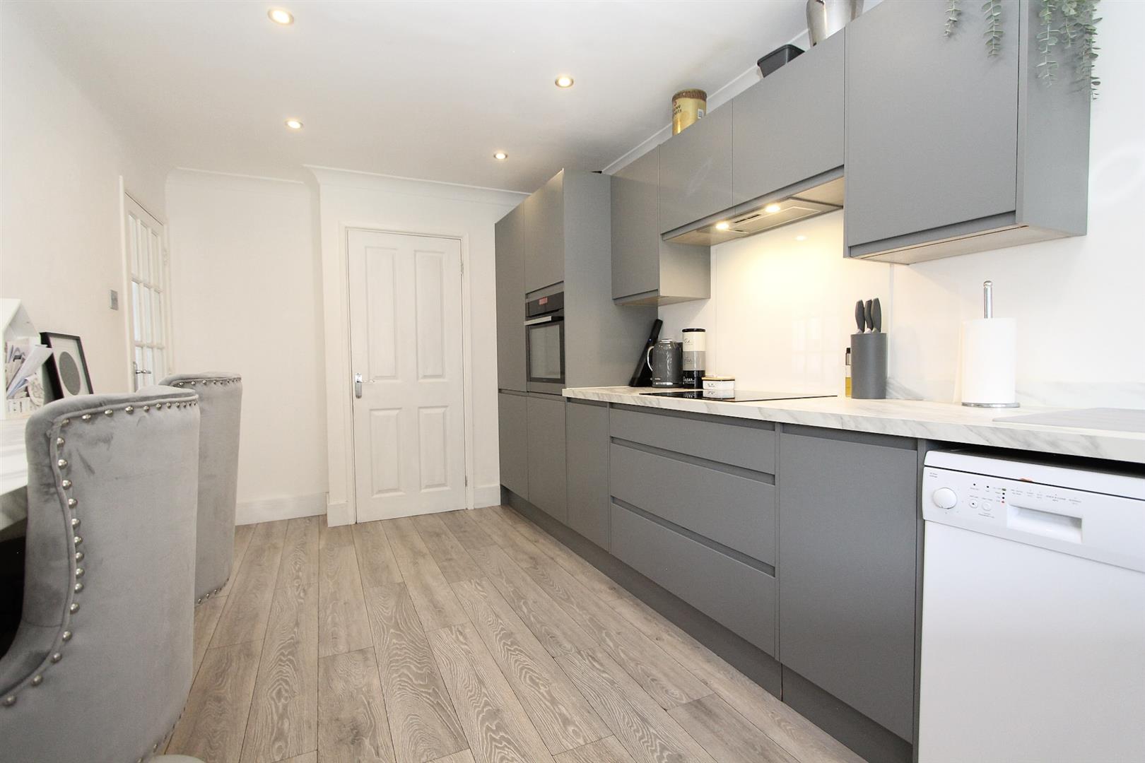 Range of modern grey fitted kitchen units and drawers, laminate worktop, inset sink with chrome mixer tap, integrated oven and electric hob with extractor fan above, integrated fridge freezer, space for slimline dishwasher, breakfast bar, radiator, laminate flooring, double glazed window and door leading to conservatory.