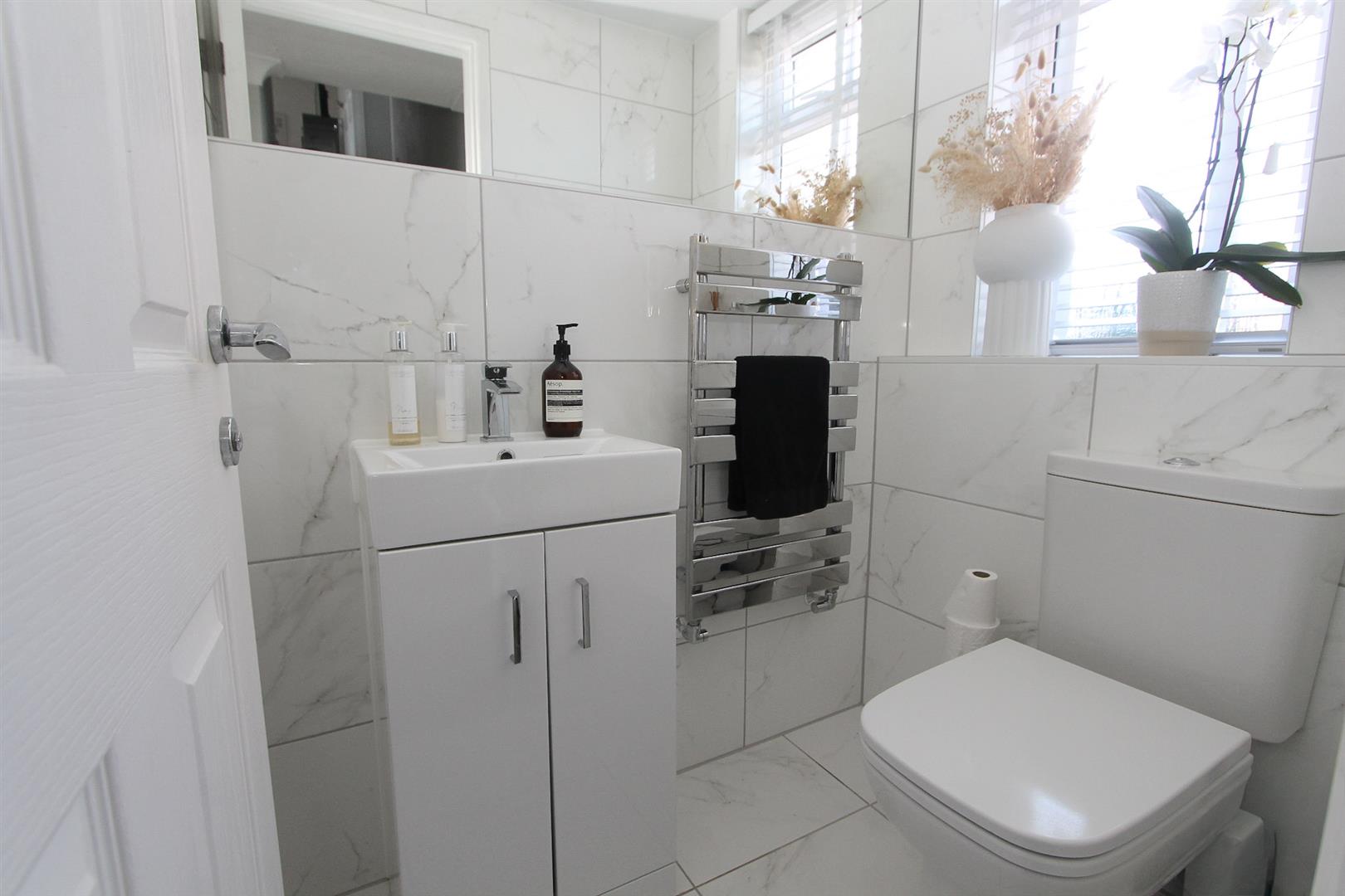 WC, vanity wash handbasin with chrome mix tap and storage below, heated chrome towel rail, tiled walls, tiled flooring, double glazed window to side aspect.