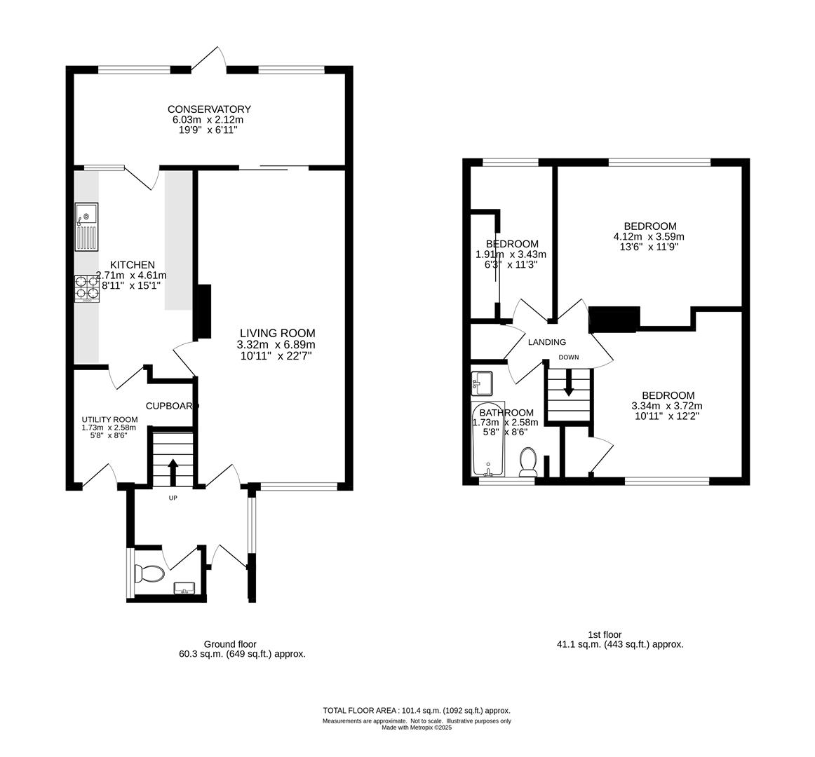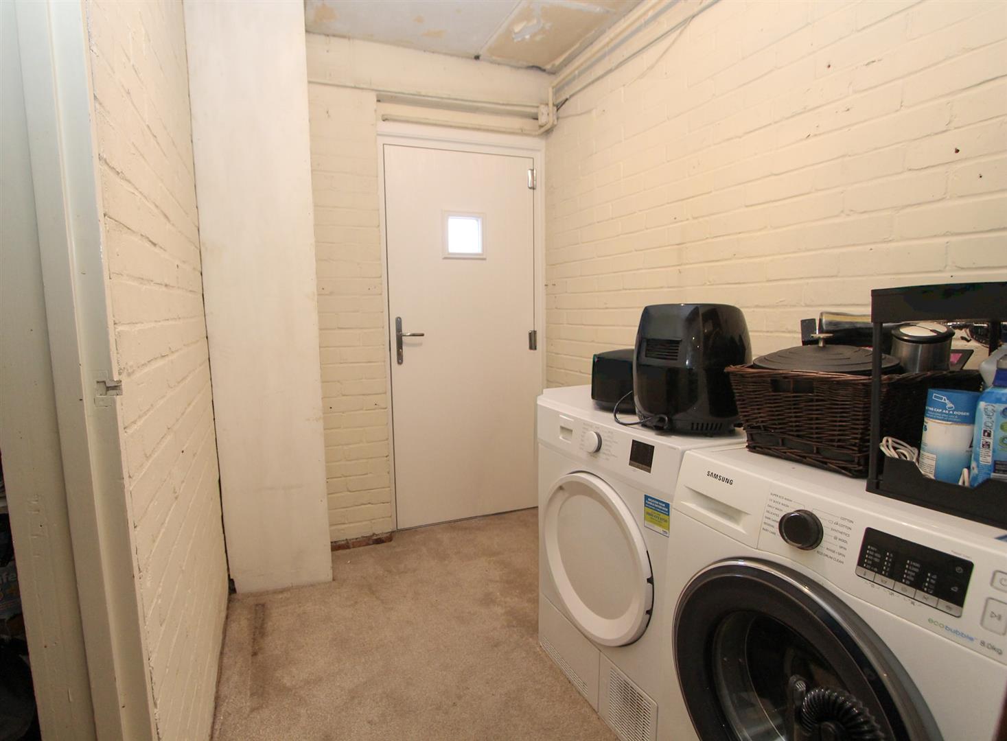 Space and plumbing for washing machine and tumble dryer, storage space, door providing access to front garden.