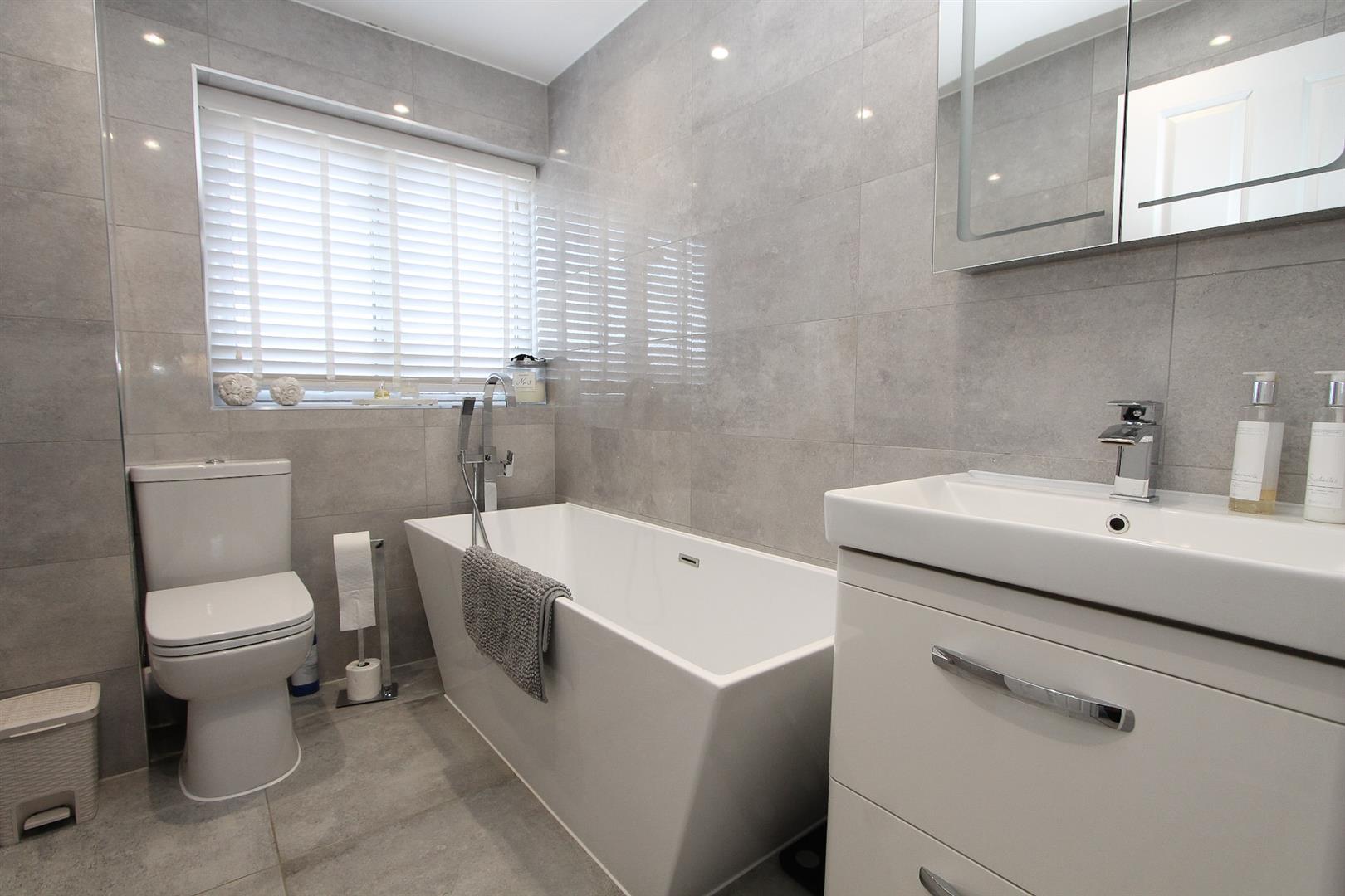 Three piece suite comprising of bath tub with chrome mixer tap and and hand shower attachment, vanity wash hand basin with chrome mixer tap and storage below, WC, heated chrome towel rail, tiled walls, tiled flooring, double glazed obscure window to front aspect.